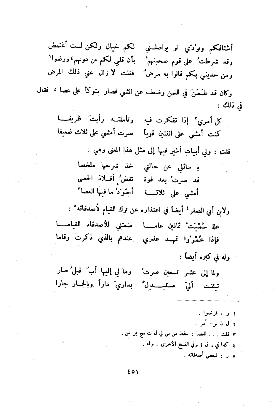 أمشي على ثلاثة ... أجود ما فيها العصا (3) ولابن أبي الصقر (4) أيضا في اعتذاره عن ترك القيام لأصدقائه (5) :