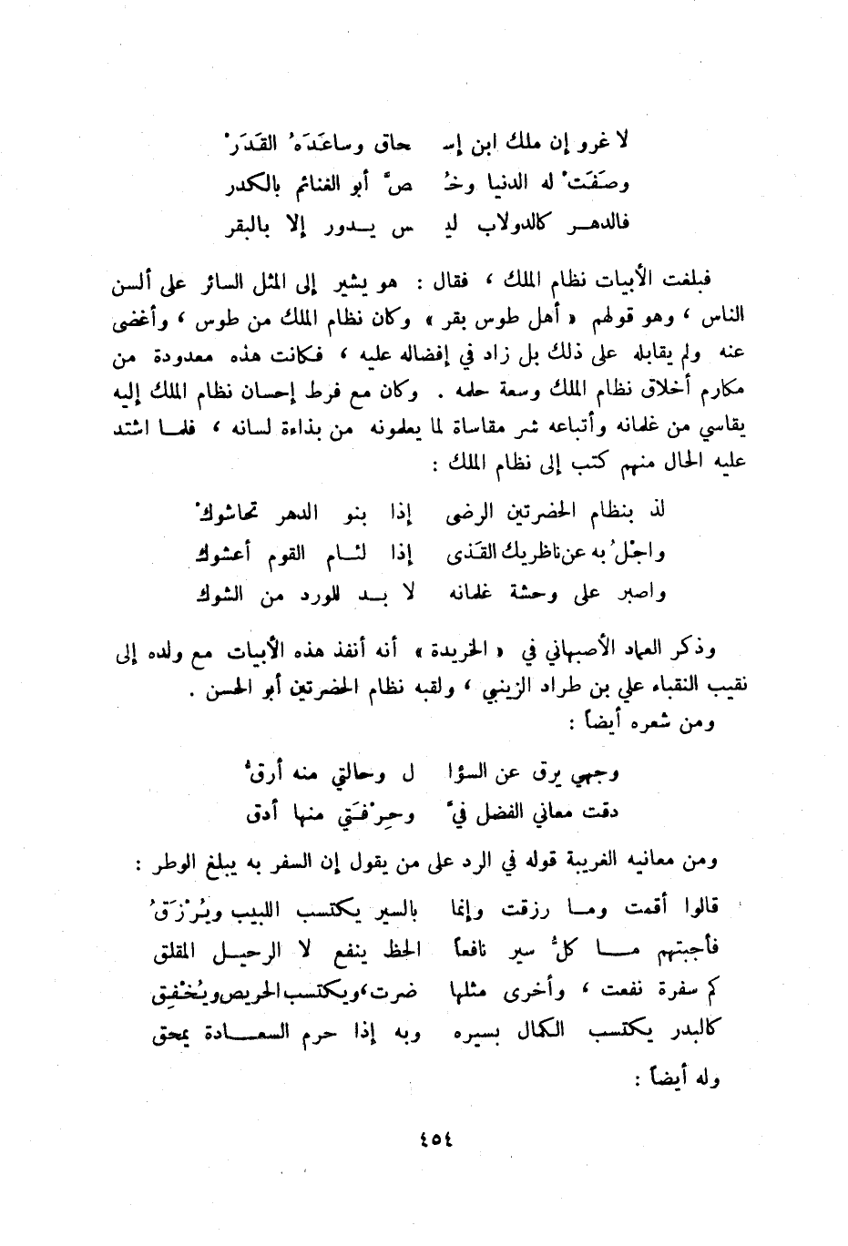 واصبر على وحشة غلمانه ... لا بد للورد من الشوك وذكر العماد الأصبهاني فيالخريدة أنه أنفذ هذه الأبيات مع ولده إلى نقيب النقباء علي بن طراد الزبيبي، ولقبه نظام الحضرتين أبو الحسن.