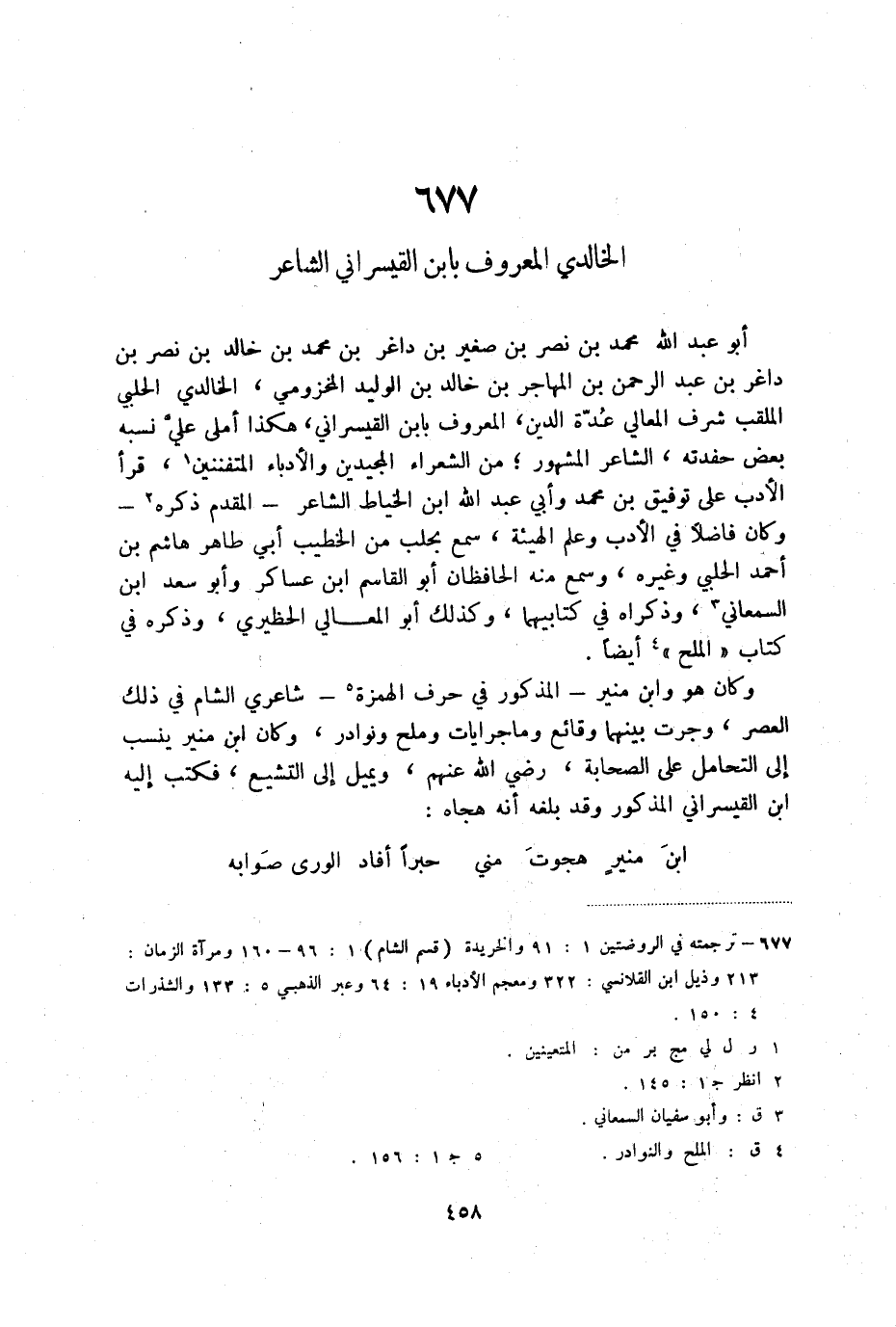 وكان هو وابن منير - المذكور في حرف الهمزة (6) - شاعري الشام في ذلك العصر، وجرت بينهما وقائع وماجرايات وملح ونوادر، وكان ابن منير ينسب إلى التحامل على الصحابة، رضي الله عنهم، ويميل إلى التشيع، فكتب إليه ابن القيسراني المذكور وقد بلغه أنه هجاه: