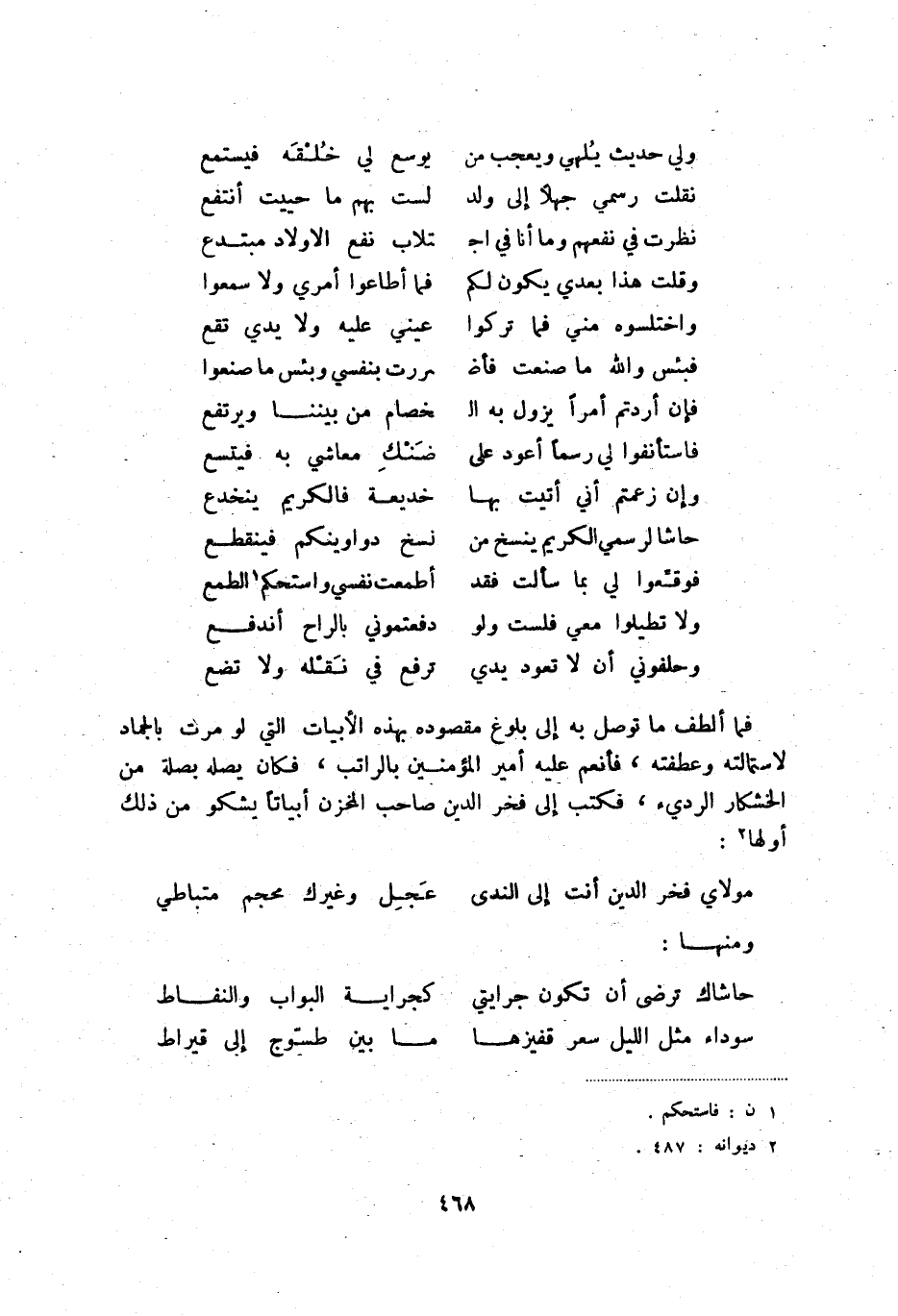 وحلفوني أن لا تعود يدي ... ترفع في نقله ولا تضع فما ألطف ما توصل به إلى بلوغ مقصوده بهذه الأبيات التي لو مرت بالجماد لاستمالته وعطفته، فأنعم عليه أمير المؤمنين بالراتب، فكان يصله بصلة من الخشكار الرديء، فطتب إلى فخر الدين صاحب المخزن أبياتا يشكو من ذلك أولها (2) :