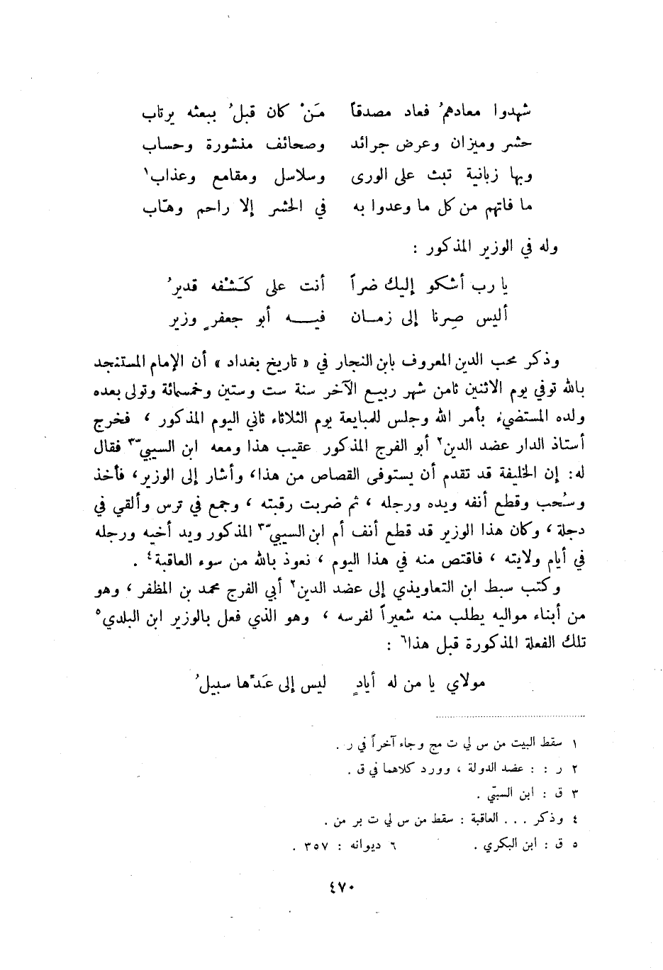 أليس صرنا زمان ... فيه أبو جعفر وزير وذكر محب الدين المعروف بابن النجار فيتاريخ بغداد أن الإمام المستنجد بالله توفي يوم الاثنين ثامن شهر ربيع الآخر سنة وستين وخمسمائة وتولى بعده ولده المستضيء بأمر الله وجلس للمبايعة يوم الثلاثاء ثاني اليوم المذكور، فخرج أستاذ الدار عضد الدين (2) أبو الفرج المذكور عقيب هذا ومعه ابن السيبي فقال له: إن الخليفة قد تقدم أن يستوفي القصاص من هذان وأشار إلى الوزير، فأخذ وسحب وقطع أنفه ويده ورجلهن ثم ضربت رقبته، وجمع في ترس وألقي في دجلة، وكان هذا الوزير قد قطع أنف أم ابن السيبي (3) المذكور ويد أخيه ورجله في أيام ولايته، فاقتص منه في هذا اليوم، نعوذ بالله من سوء العاقبة (4) .