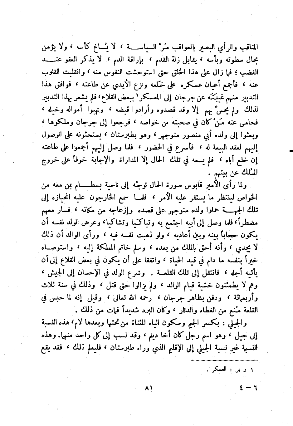 المناقب والرأي البصير بالعواقب مر السياسة، لا يساغ كأسه، ولا يؤمن بحال سطوته وبأسه، يقابل زلة القدم، بإراقة الدم، لا يذكر العفو عند الغضب، فما زال على هذا الخلق حتى استوحشت النفوس منه، وانقلبت القلوب عنه، فأجمع أعيان عسكره على خلعه ونزع الأيدي عن طاعته، فوافق هذا التدبير منهم غيبته عن جرجان إلى المعسكر (1) ببعض القلاع، فلم يشعر بهذا التدبير لذلك ولم يحس بهم إلا وقد قصدوه وأرادوا قبضه، ونهبوا أمواله وخيله، فحامى عنه من كان في صحبته من خواصه، فرجعوا إلى جرجان وملكوها، وبعثوا إلى ولده أبي منصور منوجهر، وهو بطبرستان، يستحثونه على الوصول إيهم لعقد البيعة له، فأسرع في الحضور، فلما وصل إليهم أجمعوا على طاعته إن خلع أباه، فلم يسعه في تلك الحال إلا المداراة والإجابة خوفا على خروج الملك عن بيتهم.