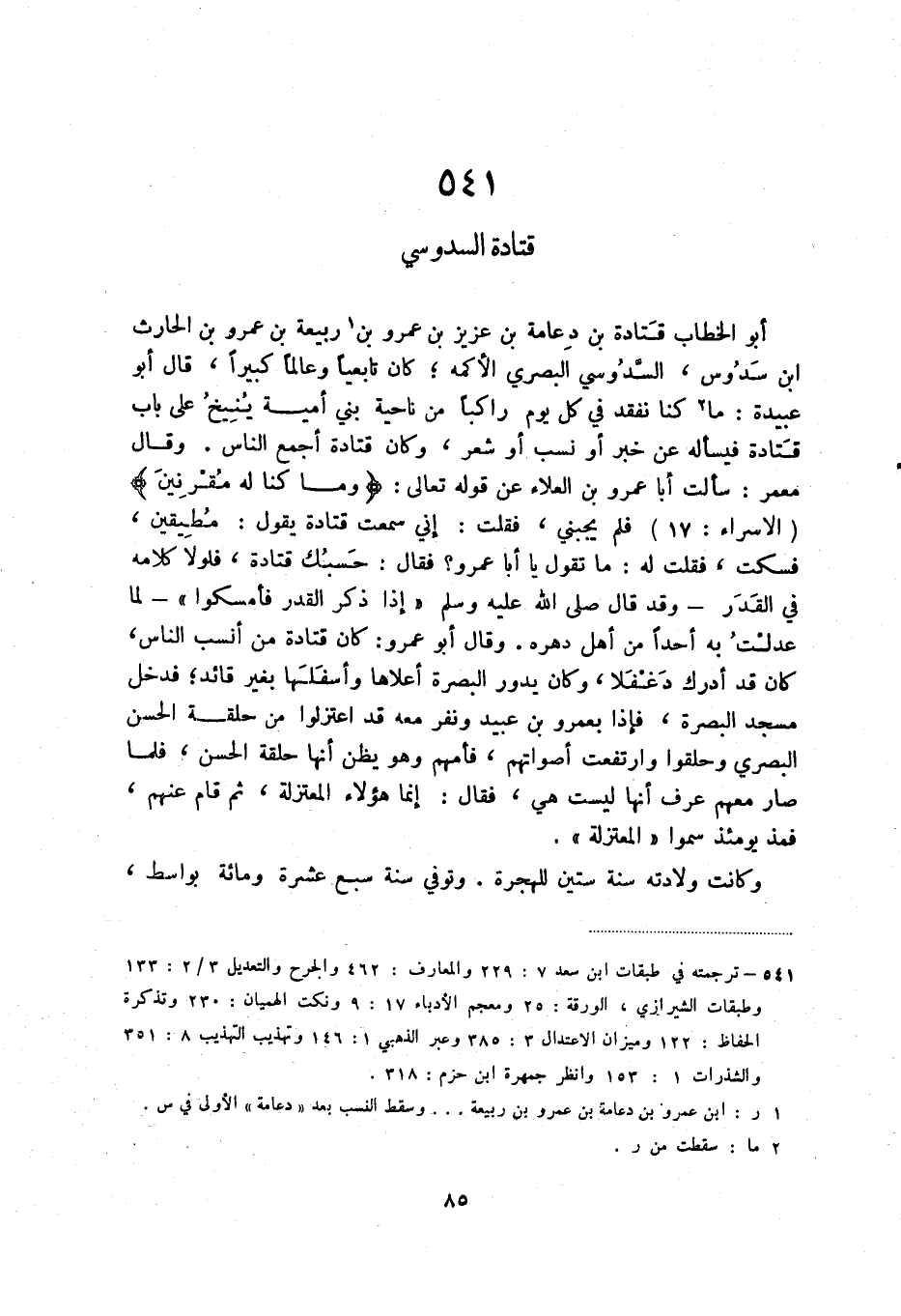 أبو الخطاب قتادة بن دعامة بن عزيز بن عمرو بن (2) ربيعة بن عمرو بن الحارث ابن سدوس، السدوسي البصري الأكمه، كان تابعيا وعالما كبيرا، قال أبو عبيدة: ما (3) كنا نفقد في كل يوم راكبا من ناحية بني أمية ينيخ على باب قتادة فيسأله عن خبر أو نسب أو شعر، وكان قتادة أجمع الناس. وقال معمر: سألت أبا عمرو بن العلاء عن قوله تعالى: (وما كنا له مقرنين) ، فلم يجبني، فقلت: إني سمعت قتادة يقول: مطيقين، فسكت، فقلت له: ما تقول يا أبا عمرو فقال: حسبك قتادة، فلولا كلامه في القدر - وقد قال صلى الله عليه وسلم إذا ذكر القدر فأمسكوا - لما عدلت به أحدا من أهل دهره. وقال أبو عمرو: كان قتادة من أنسب الناس، كان قد أدرك دغفلا، وكان يدور البصرة أعلاها وأسفلها بغير قائد، فدخل مسجد البصرة، فإذا بعمرو بن عبيد ونفر معه قد اعتزلوا من حلقة الحسن البصري وحلقوا وارتفعت أصواتهم، فأمهم وهو يظن أنها حلقة الحسن، فلما صار معهم عرف أنها ليست هي، فقال: إنما هؤلاء المعتزلة، ثم قام عنهم، فمذ يومئذ سموا المعتزلة.
