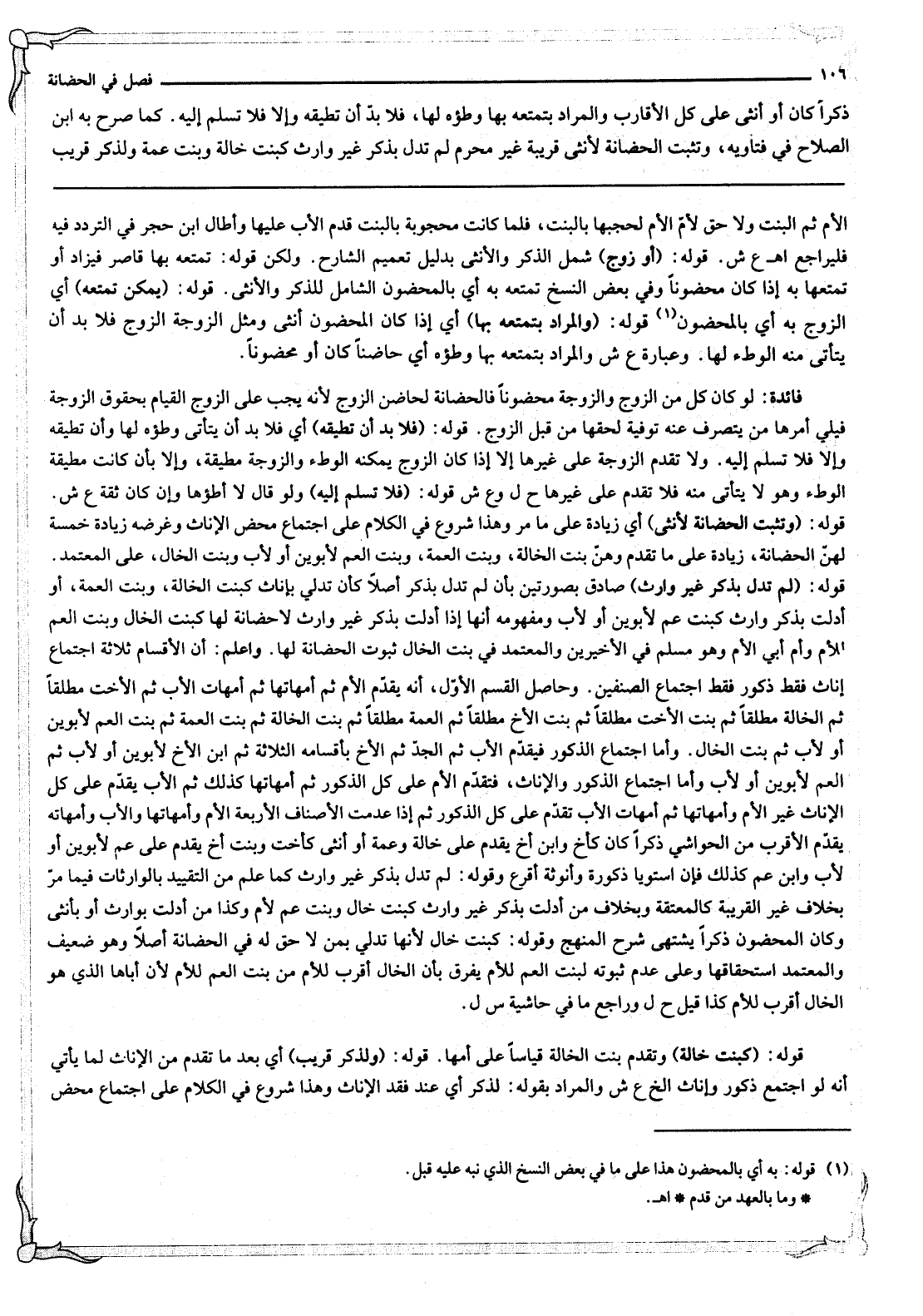 قَوْلُهُ: (وَتَثْبُتُ الْحَضَانَةُ لِأُنْثَى) أَيْ زِيَادَةً عَلَى مَا مَرَّ وَهَذَا شُرُوعٌ فِي الْكَلَامِ عَلَى اجْتِمَاعِ مَحْضِ الْإِنَاثِ وَغَرَضُهُ زِيَادَةُ خَمْسَةٍ لَهُنَّ الْحَضَانَةُ، زِيَادَةً عَلَى مَا تَقَدَّمَ وَهُنَّ بِنْتُ الْخَالَةِ، وَبِنْتُ الْعَمَّةِ، وَبِنْتُ الْعَمِّ لِأَبَوَيْنِ، أَوْ لِأَبٍ وَبِنْتُ الْخَالِ، عَلَى الْمُعْتَمَدِ.