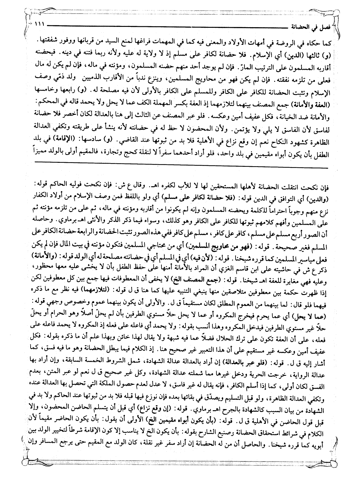 قَوْلُهُ: (فَلَا حَضَانَةَ لِكَافِرٍ عَلَى مُسْلِمٍ) أَيْ وَلَوْ بِاللَّفْظِ فَمَنْ وَصَفَ الْإِسْلَامَ مِنْ أَوْلَادِ الْكُفَّارِ نُزِعَ مِنْهُمْ وُجُوبًا احْتِرَامًا لِلْكَلِمَةِ وَيَحْضُنُهُ الْمُسْلِمُونَ، وَإِنْ لَمْ يَكُونُوا مِنْ أَقَارِبِهِ، وَمُؤْنَتُهُ فِي مَالِهِ، ثُمَّ عَلَى مَنْ تَلْزَمُهُ مُؤْنَتُهُ، ثُمَّ عَلَى الْمُسْلِمِينَ وَأَفْهَمَ كَلَامُهُمْ ثُبُوتَهَا لِلْكَافِرِ عَلَى الْكَافِرِ وَهُوَ كَذَلِكَ، وَسَوَاءٌ فِيمَا ذُكِرَ الذَّكَرُ وَالْأُنْثَى. اهـ. بِرْمَاوِيٌّ.