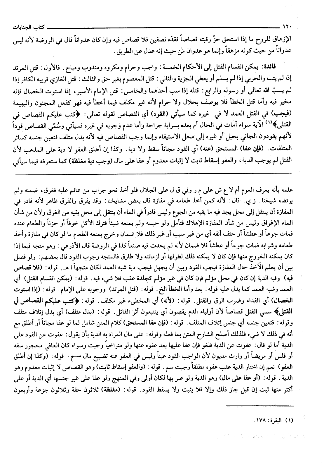 وَالثَّالِثُ قَتْلُ الْغَازِي قَرِيبَهُ الْكَافِرَ إذَا لَمْ يَسُبَّ اللَّهَ تَعَالَى أَوْ رَسُولَهُ وَالرَّابِعُ قَتْلُهُ إذَا سَبَّ أَحَدَهُمَا وَالْخَامِسُ قَتْلُ الْإِمَامِ الْأَسِيرَ إذَا اسْتَوَتْ الْخِصَالُ فَإِنَّهُ مُخَيَّرٌ فِيهِ وَأَمَّا قَتْلُ الْخَطَأِ فَلَا يُوصَفُ بِحَلَالٍ وَلَا حَرَامٍ لِأَنَّهُ غَيْرُ مُكَلَّفٍ فِيمَا أَخْطَأَ فِيهِ فَهُوَ كَفِعْلِ الْمَجْنُونِ وَالْبَهِيمَةِ فَيَجِبَ فِي الْقَتْلِ الْعَمْدِ لَا فِي غَيْرِهِ كَمَا سَيَأْتِي الْقَوَدُ أَيْ الْقِصَاصُ لِقَوْلِهِ تَعَالَى {كُتِبَ عَلَيْكُمُ الْقِصَاصُ فِي الْقَتْلَى} [البقرة: 178] الْآيَةَ سَوَاءٌ أَمَاتَ فِي الْحَالِ أَمْ بَعْدَهُ بِسِرَايَةِ جِرَاحَةٍ وَأَمَّا عَدَمُ وُجُوبِهِ فِي غَيْرِهِ فَسَيَأْتِي وَسُمِّيَ الْقِصَاصُ قَوَدًا لِأَنَّهُمْ يَقُودُونَ الْجَانِيَ بِحَبْلٍ أَوْ غَيْرِهِ إلَى مَحَلِّ الِاسْتِيفَاءِ وَإِنَّمَا وَجَبَ الْقِصَاصُ فِيهِ لِأَنَّهُ بَدَلُ مُتْلَفٍ فَتَعَيَّنَ جِنْسُهُ كَسَائِرِ الْمُتْلَفَاتِ