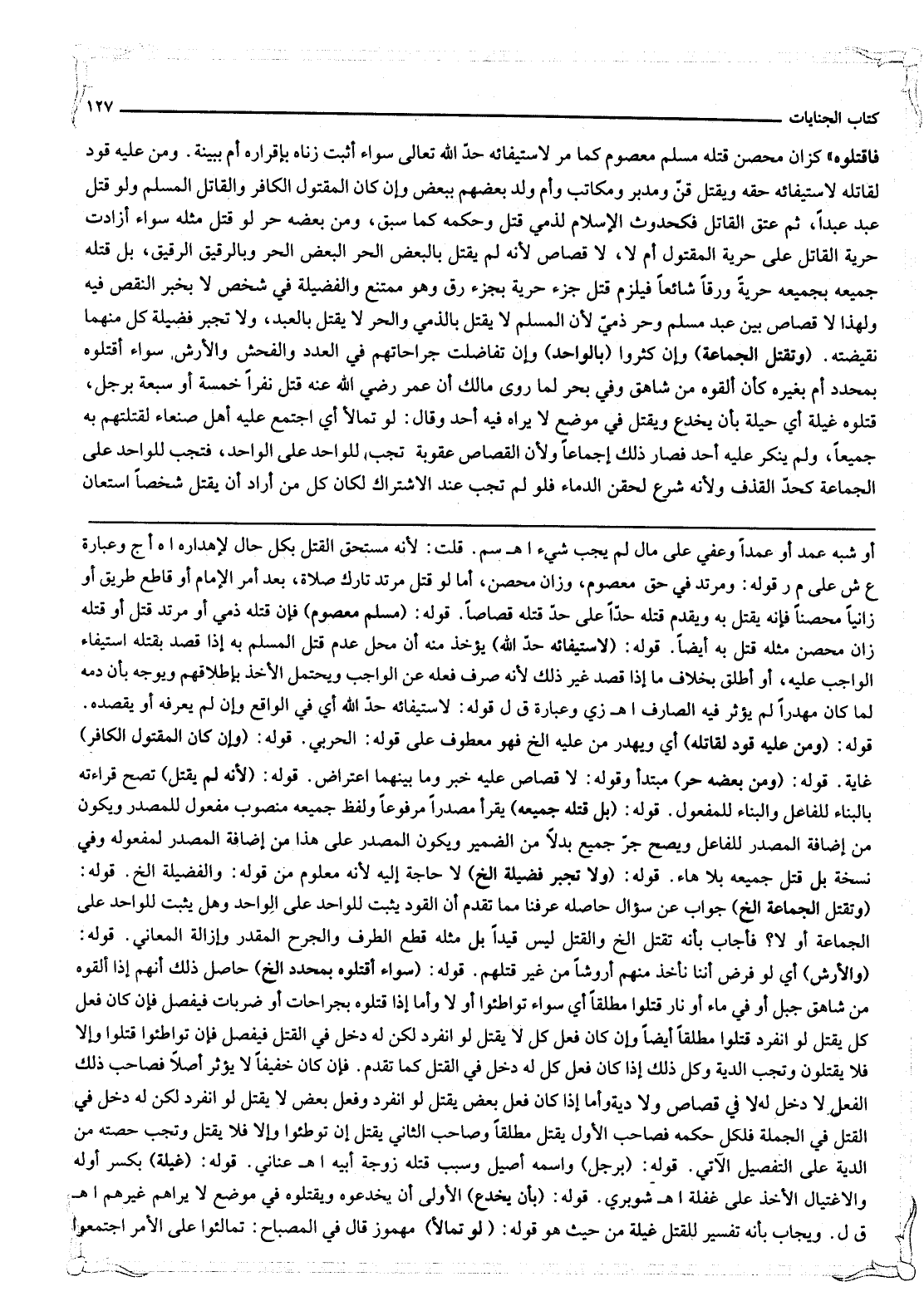 فَاقْتُلُوهُ» كَزَانٍ مُحْصَنٍ قَتَلَهُ مُسْلِمٌ مَعْصُومٌ كَمَا مَرَّ لِاسْتِيفَائِهِ حَدَّ اللَّهِ تَعَالَى سَوَاءٌ أَثَبَتَ زِنَاهُ بِإِقْرَارِهِ أَمْ بِبَيِّنَةٍ: وَمَنْ عَلَيْهِ قَوَدٌ لِقَاتِلِهِ لِاسْتِيفَائِهِ حَقَّهُ، وَيُقْتَلُ قِنٌّ وَمُدَبَّرٌ وَمُكَاتَبٌ وَأُمُّ وَلَدٍ بَعْضُهُمْ بِبَعْضٍ وَإِنْ كَانَ الْمَقْتُولُ الْكَافِرَ، وَالْقَاتِلُ الْمُسْلِمَ، وَلَوْ قَتَلَ عَبْدٌ عَبْدًا، ثُمَّ عَتَقَ الْقَاتِلُ فَكَحُدُوثِ الْإِسْلَامِ لِذِمِّيٍّ قَتَلَ وَحُكْمُهُ كَمَا سَبَقَ، وَمَنْ بَعْضُهُ حُرٌّ لَوْ قَتَلَ مِثْلَهُ سَوَاءٌ أَزَادَتْ حُرِّيَّةُ الْقَاتِلِ عَلَى حُرِّيَّةِ الْمَقْتُولِ أَمْ لَا، لَا قِصَاصَ لِأَنَّهُ لَمْ يَقْتُلْ بِالْبَعْضِ الْحُرِّ الْبَعْضَ الْحُرَّ، وَبِالرَّقِيقِ الرَّقِيقَ، بَلْ قَتْلُهُ جَمِيعَهُ بِجَمِيعِهِ حُرِّيَّةً وَرِقًّا شَائِعًا فَيَلْزَمُ قَتْلُ جُزْءِ حُرِّيَّةٍ بِجُزْءِ رِقٍّ وَهُوَ مُمْتَنِعٌ وَالْفَضِيلَةُ فِي شَخْصٍ لَا بِخَبَرِ النَّقْصِ فِيهِ وَلِهَذَا لَا قِصَاصَ بَيْنَ عَبْدٍ مُسْلِمٍ وَحُرٍّ ذِمِّيٍّ، لِأَنَّ الْمُسْلِمَ لَا يُقْتَلُ بِالذِّمِّيِّ وَالْحُرَّ لَا يُقْتَلُ بِالْعَبْدِ، وَلَا تَجْبُرُ فَضِيلَةُ كُلٍّ مِنْهُمَا نَقِيضَتَهُ.