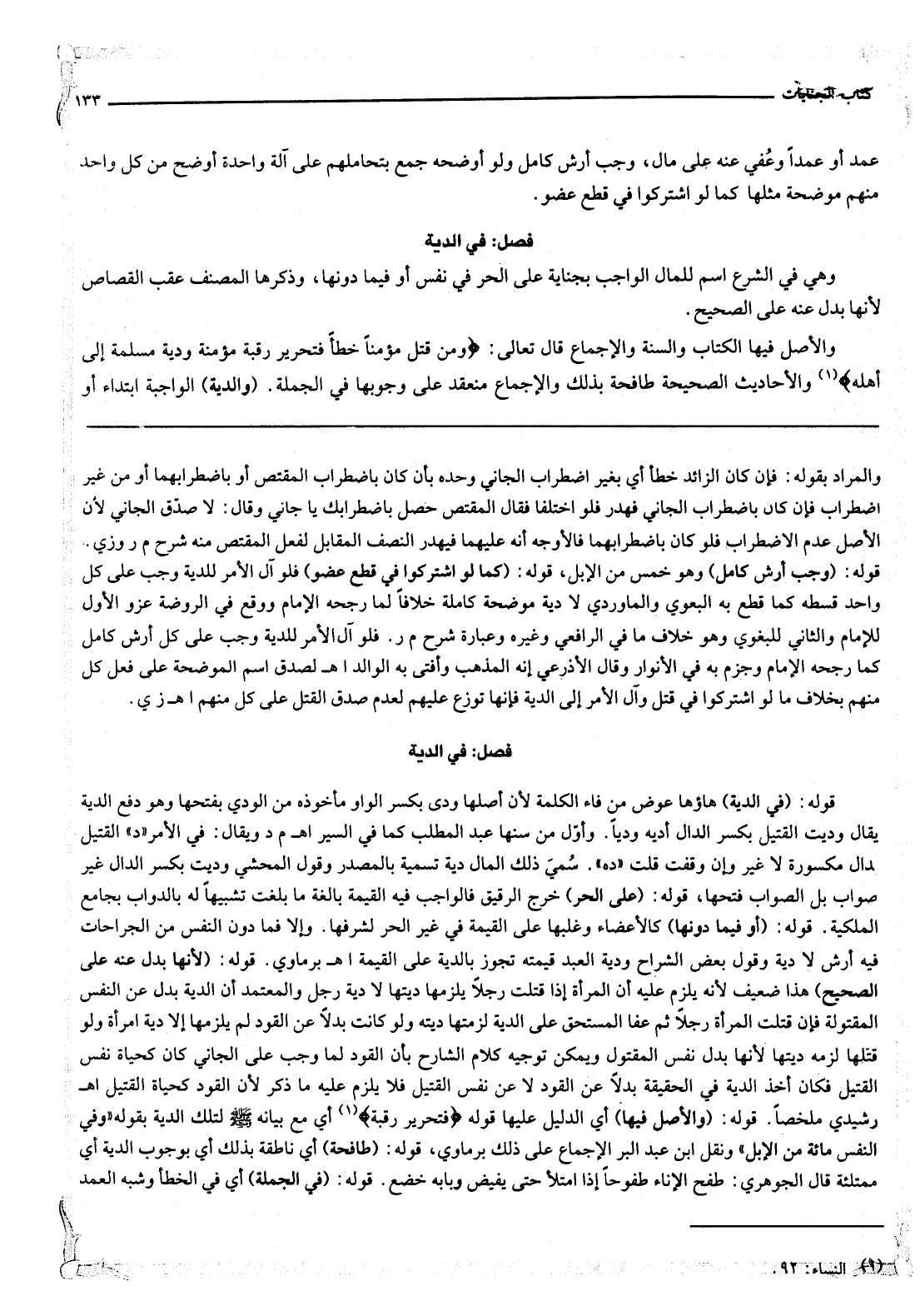 قَوْلُهُ {فَتَحْرِيرُ رَقَبَةٍ} [النساء: 92] أَيْ مَعَ بَيَانِهِ - صَلَّى اللَّهُ عَلَيْهِ وَسَلَّمَ - لِتِلْكَ الدِّيَةِ بِقَوْلِهِ «وَفِي النَّفْسِ مِائَةٌ مِنْ الْإِبِلِ» وَنَقَلَ ابْنُ عَبْدِ الْبَرِّ الْإِجْمَاعَ عَلَى ذَلِكَ بِرْمَاوِيٌّ.