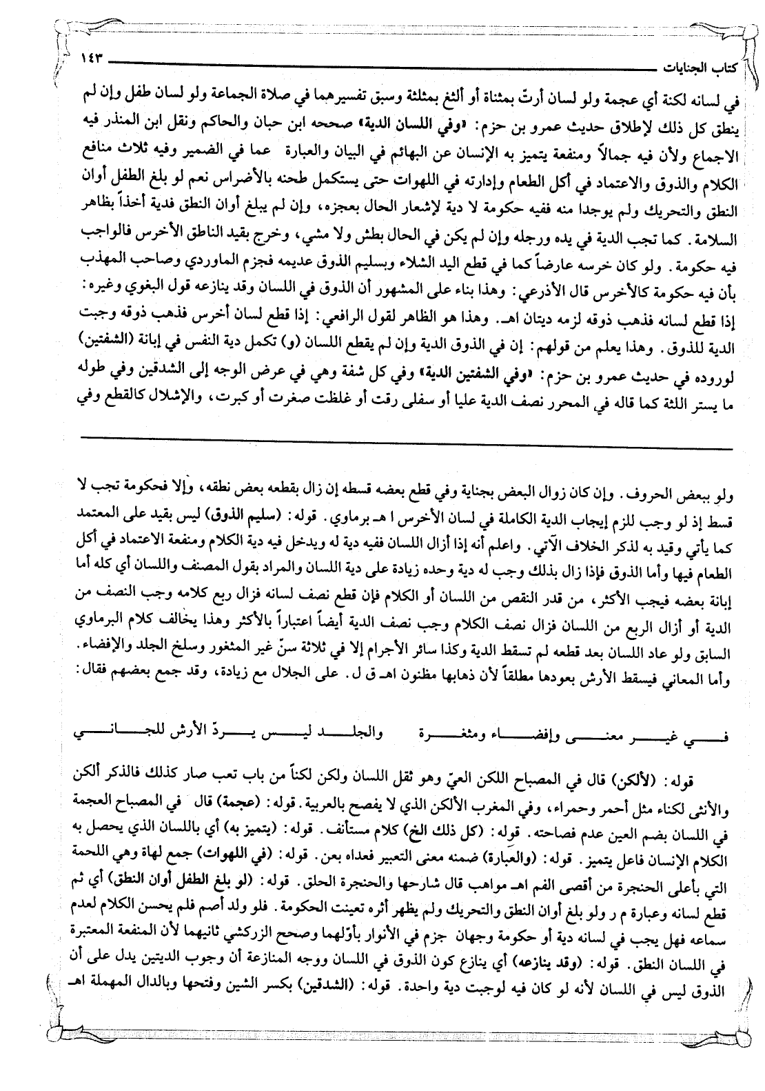 فِي لِسَانِهِ لُكْنَةٌ أَيْ عُجْمَةٌ وَلَوْ لِسَانَ أَرَتَّ بِمُثَنَّاةٍ، أَوْ أَلْثَغَ بِمُثَلَّثَةٍ وَسَبَقَ تَفْسِيرُهُمَا فِي صَلَاةِ الْجَمَاعَةِ وَلَوْ لِسَانَ طِفْلٍ، وَإِنْ لَمْ يَنْطِقْ، كُلُّ ذَلِكَ لِإِطْلَاقِ حَدِيثِ عَمْرِو بْنِ حَزْمٍ: «وَفِي اللِّسَانِ الدِّيَةُ» صَحَّحَهُ ابْنُ حِبَّانَ وَالْحَاكِمُ وَنَقَلَ ابْنُ الْمُنْذِرِ فِيهِ الْإِجْمَاعَ وَلِأَنَّ فِيهِ جَمَالًا وَمَنْفَعَةً يَتَمَيَّزُ بِهِ الْإِنْسَانُ عَنْ الْبَهَائِمِ فِي الْبَيَانِ وَالْعِبَارَةِ عَمَّا فِي الضَّمِيرِ وَفِيهِ ثَلَاثُ مَنَافِعَ: الْكَلَامُ وَالذَّوْقُ وَالِاعْتِمَادُ فِي أَكْلِ الطَّعَامِ، وَإِدَارَتِهِ فِي اللَّهَوَاتِ حَتَّى يَسْتَكْمِلَ طَحْنَهُ بِالْأَضْرَاسِ نَعَمْ لَوْ بَلَغَ الطِّفْلُ أَوَانَ النُّطْقِ وَالتَّحْرِيكِ وَلَمْ يُوجَدَا مِنْهُ فَفِيهِ حُكُومَةٌ لَا دِيَةٌ لِإِشْعَارِ الْحَالِ بِعَجْزِهِ، وَإِنْ لَمْ يَبْلُغْ أَوَانَ النُّطْقِ فَدِيَةٌ أَخْذًا بِظَاهِرِ السَّلَامَةِ.