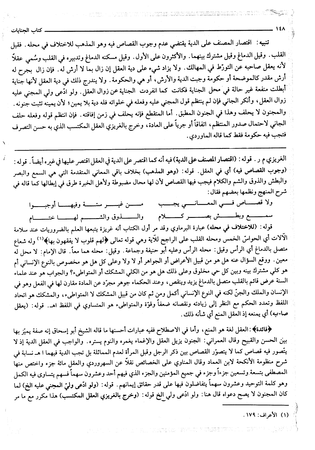 وَالْوَاجِبُ فِي الْعَقْلِ الدِّيَةُ؛ إذْ لَا يُتَصَوَّرُ فِيهِ قِصَاصٌ كَمَا لَا يُتَصَوَّرُ الْقِصَاصُ بَيْنَ ذَكَرِ الرَّجُلِ وَقُبُلِ الْمَرْأَةِ لِعَدَمِ الْمُمَاثَلَةِ بَلْ تَجِبُ الدِّيَةُ فِيهِمَا اهـ نَسَّابَةُ فِي شَرْحِ مَنْظُومَةِ الْأَنْكِحَةِ لِابْنِ الْعِمَادِ وَقَالَ الْمُنَاوِيُّ عَلَى الْخَصَائِصِ نَقْلًا عَنْ السُّهْرَوَرْدِيِّ: وَالْعَقْلُ مِائَةُ جُزْءٍ وَاخْتُصَّ مِنْهَا الْمُصْطَفَى بِتِسْعَةٍ وَتِسْعِينَ جُزْءًا، وَجُزْءٌ فِي جَمِيعِ الْمُؤْمِنِينَ، وَالْجُزْءُ الَّذِي فِيهِمْ أَحَدٌ وَعِشْرُونَ سَهْمًا فَسَهْمٌ يَتَسَاوَى فِيهِ الْكُلُّ وَهُوَ كَلِمَةُ التَّوْحِيدِ وَعِشْرُونَ سَهْمًا يَتَفَاضَلُونَ فِيهَا عَلَى قَدْرِ حَقَائِقِ إيمَانِهِمْ.