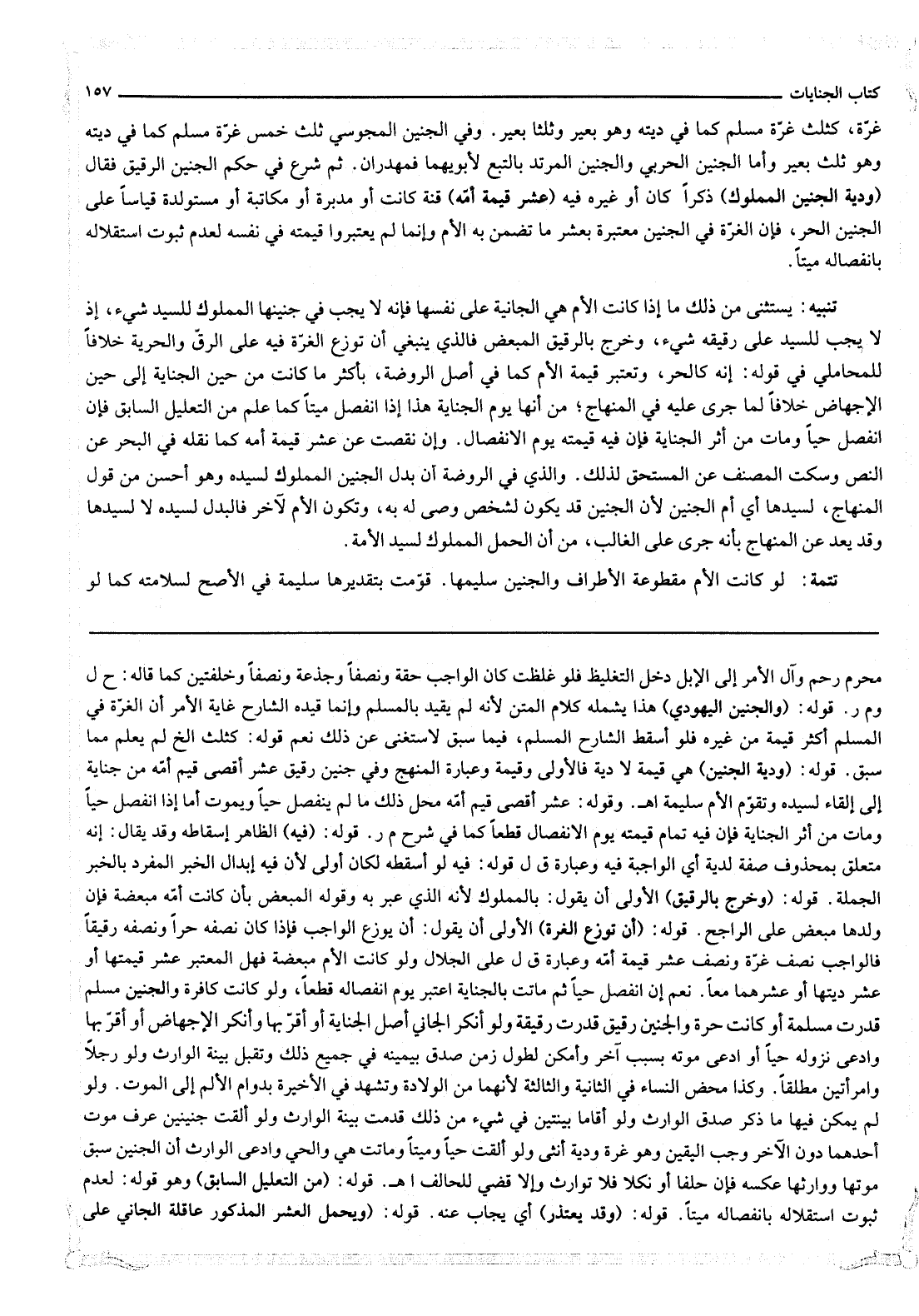 ، ثُمَّ شَرَعَ فِي حُكْمِ الْجَنِينِ الرَّقِيقِ فَقَالَ (وَدِيَةُ الْجَنِينِ الْمَمْلُوكِ) ذَكَرًا كَانَ، أَوْ غَيْرَهُ فِيهِ (عُشْرُ قِيمَةِ أُمِّهِ) قِنَّةً كَانَتْ أَوْ مُدَبَّرَةً، أَوْ مُكَاتَبَةً، أَوْ مُسْتَوْلَدَةً قِيَاسًا عَلَى الْجَنِينِ الْحُرِّ، فَإِنَّ الْغُرَّةَ فِي الْجَنِينِ مُعْتَبَرَةٌ بِعُشْرِ مَا تُضْمَنُ بِهِ الْأُمُّ وَإِنَّمَا لَمْ يَعْتَبِرُوا قِيمَتَهُ فِي نَفْسِهِ لِعَدَمِ ثُبُوتِ اسْتِقْلَالِهِ بِانْفِصَالِهِ مَيِّتًا.