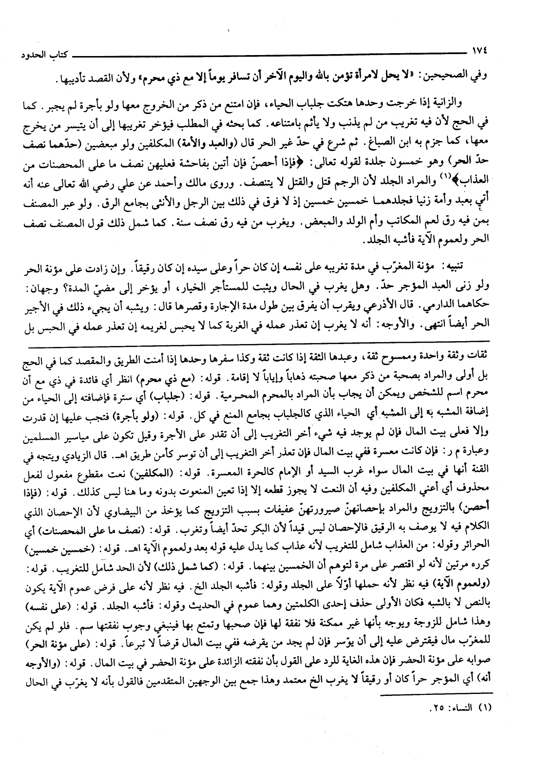 قَوْلُهُ: {نِصْفُ مَا عَلَى الْمُحْصَنَاتِ} [النساء: 25] أَيْ الْحَرَائِرِ وَقَوْلُهُ: مِنْ الْعَذَابِ شَامِلٌ لِلتَّغْرِيبِ، لِأَنَّهُ عَذَابٌ كَمَا يَدُلُّ عَلَيْهِ قَوْلُهُ بَعْدُ " وَلِعُمُومِ الْآيَةِ " اهـ.