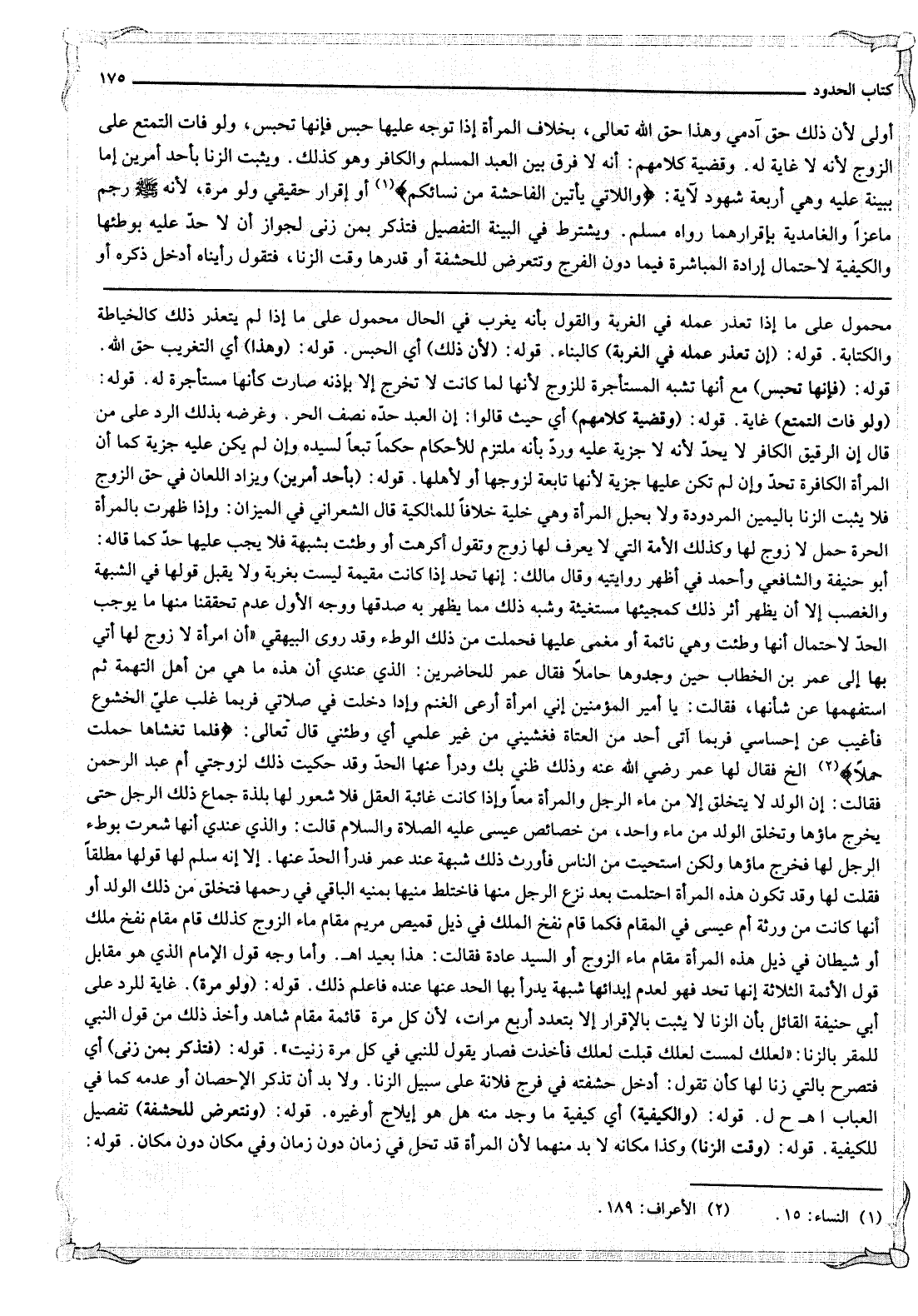 وَيَثْبُتُ الزِّنَا بِأَحَدِ أَمْرَيْنِ إمَّا بِبَيِّنَةٍ عَلَيْهِ وَهِيَ أَرْبَعَةُ شُهُودٍ لِآيَةِ: {وَاللاتِي يَأْتِينَ الْفَاحِشَةَ مِنْ نِسَائِكُمْ} [النساء: 15] ، أَوْ إقْرَارٍ حَقِيقِيٍّ وَلَوْ مَرَّةً، لِأَنَّهُ - صَلَّى اللَّهُ عَلَيْهِ وَسَلَّمَ - رَجَمَ مَاعِزًا وَالْغَامِدِيَّةَ بِإِقْرَارِهِمَا رَوَاهُ مُسْلِمٌ. وَيُشْتَرَطُ فِي الْبَيِّنَةِ التَّفْصِيلُ فَتَذْكُرُ بِمَنْ زَنَى لِجَوَازِ أَنْ لَا حَدَّ عَلَيْهِ بِوَطْئِهَا وَالْكَيْفِيَّةَ لِاحْتِمَالِ إرَادَةِ الْمُبَاشَرَةِ فِيمَا دُونَ الْفَرْجِ وَتَتَعَرَّضُ لِلْحَشَفَةِ، أَوْ قَدْرِهَا وَقْتَ الزِّنَا، فَتَقُولُ رَأَيْنَاهُ أَدْخَلَ ذَكَرَهُ، أَوْ