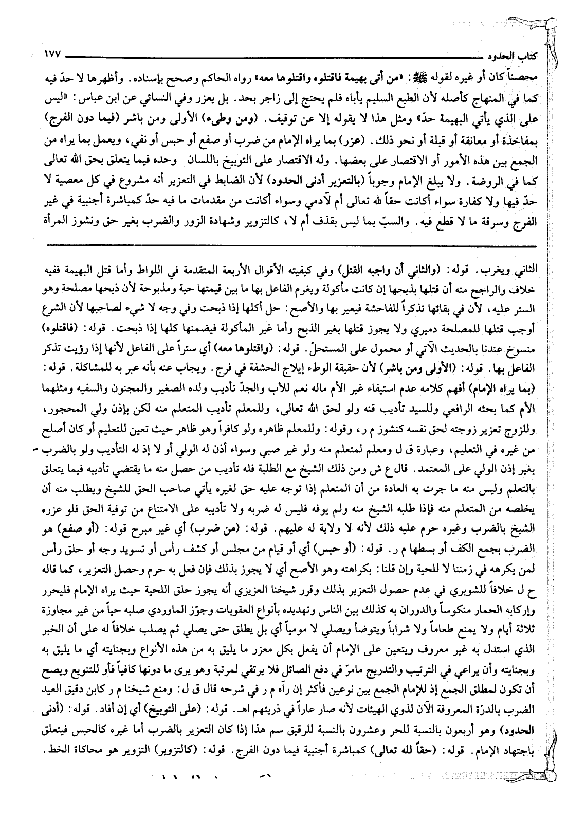 مُحْصَنًا كَانَ أَوْ غَيْرَهُ لِقَوْلِهِ - صَلَّى اللَّهُ عَلَيْهِ وَسَلَّمَ -: «مَنْ أَتَى بَهِيمَةً فَاقْتُلُوهُ وَاقْتُلُوهَا مَعَهُ» رَوَاهُ الْحَاكِمُ وَصَحَّحَ إسْنَادَهُ. وَأَظْهَرُهَا لَا حَدَّ فِيهِ كَمَا فِي الْمِنْهَاجِ كَأَصْلِهِ، لِأَنَّ الطَّبْعَ السَّلِيمَ يَأْبَاهُ فَلَمْ يُحْتَجْ إلَى زَاجِرٍ بِحَدٍّ. بَلْ يُعَزَّرُ وَفِي النَّسَائِيّ عَنْ ابْنِ عَبَّاسٍ: " لَيْسَ عَلَى الَّذِي يَأْتِي الْبَهِيمَةَ حَدٌّ " وَمِثْلُ هَذَا لَا يَقُولُهُ إلَّا عَنْ تَوْقِيفٍ.
