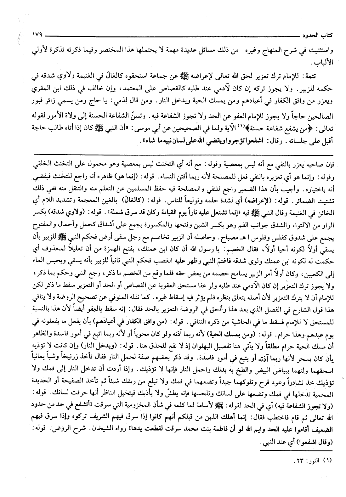 قَوْلُهُ: (وَلَا تَجُوزُ الشَّفَاعَةُ فِيهِ) أَيْ فِي الْحَدِّ لِقَوْلِهِ: - صَلَّى اللَّهُ عَلَيْهِ وَسَلَّمَ - لِأُسَامَةَ لَمَّا كَلَّمَهُ فِي شَأْنِ الْمَخْزُومِيَّةِ الَّتِي سَرَقَتْ «أَتَشْفَعُ فِي حَدٍّ مِنْ حُدُودِ اللَّهِ تَعَالَى، ثُمَّ قَامَ فَاخْتَطَبَ فَقَالَ: إنَّمَا أَهْلَكَ الَّذِينَ مِنْ قَبْلِكُمْ أَنَّهُمْ كَانُوا إذَا سَرَقَ فِيهِمْ الشَّرِيفُ تَرَكُوهُ، وَإِذَا سَرَقَ فِيهِمْ الضَّعِيفُ أَقَامُوا عَلَيْهِ الْحَدَّ وَاَيْمُ اللَّهِ لَوْ أَنَّ فَاطِمَةَ بِنْتَ مُحَمَّدٍ سَرَقَتْ لَقَطَعْتُ يَدَهَا» رَوَاهُ الشَّيْخَانِ. شَرْحَ الرَّوْضِ.