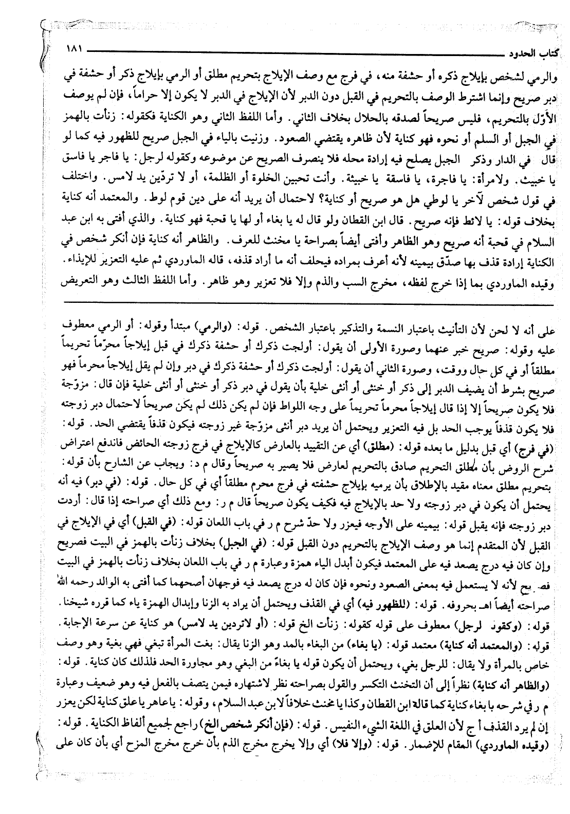 وَالرَّمْيُ لِشَخْصٍ بِإِيلَاجِ ذَكَرِهِ أَوْ حَشَفَةٍ مِنْهُ، فِي فَرْجٍ مَعَ وَصْفِ الْإِيلَاجِ بِتَحْرِيمٍ مُطْلَقٌ، أَوْ الرَّمْيُ بِإِيلَاجِ ذَكَرٍ، أَوْ حَشَفَةٍ فِي دُبُرٍ صَرِيحٌ، وَإِنَّمَا اُشْتُرِطَ الْوَصْفُ بِالتَّحْرِيمِ فِي الْقُبُلِ دُونَ الدُّبُرِ لِأَنَّ الْإِيلَاجَ فِي الدُّبُرِ لَا يَكُونُ إلَّا حَرَامًا، فَإِنْ لَمْ يُوصَفْ الْأَوَّلُ بِالتَّحْرِيمِ، فَلَيْسَ صَرِيحًا لِصِدْقِهِ بِالْحَلَالِ بِخِلَافِ الثَّانِي. وَأَمَّا اللَّفْظُ الثَّانِي وَهُوَ الْكِنَايَةُ فَكَقَوْلِهِ: زَنَأْت بِالْهَمْزِ فِي الْجَبَلِ أَوْ السُّلَّمِ، أَوْ نَحْوِهِ فَهُوَ كِنَايَةٌ لِأَنَّ ظَاهِرَهُ يَقْتَضِي الصُّعُودَ. وَزَنَيْت بِالْيَاءِ فِي الْجَبَلِ صَرِيحٌ لِلظُّهُورِ فِيهِ كَمَا لَوْ قَالَ فِي الدَّارِ وَذِكْرُ الْجَبَلِ يَصْلُحُ فِيهِ إرَادَةُ مَحَلِّهِ فَلَا يَنْصَرِفُ الصَّرِيحُ عَنْ مَوْضُوعِهِ وَكَقَوْلِهِ لِرَجُلٍ: يَا فَاجِرُ يَا فَاسِقُ يَا خَبِيثُ. وَلِامْرَأَةٍ: يَا فَاجِرَةُ، يَا فَاسِقَةُ يَا خَبِيثَةُ. وَأَنْتِ تُحِبِّينَ الْخَلْوَةَ، أَوْ الظُّلْمَةَ، أَوْ لَا تَرُدِّينَ يَدَ لَامِسٍ.