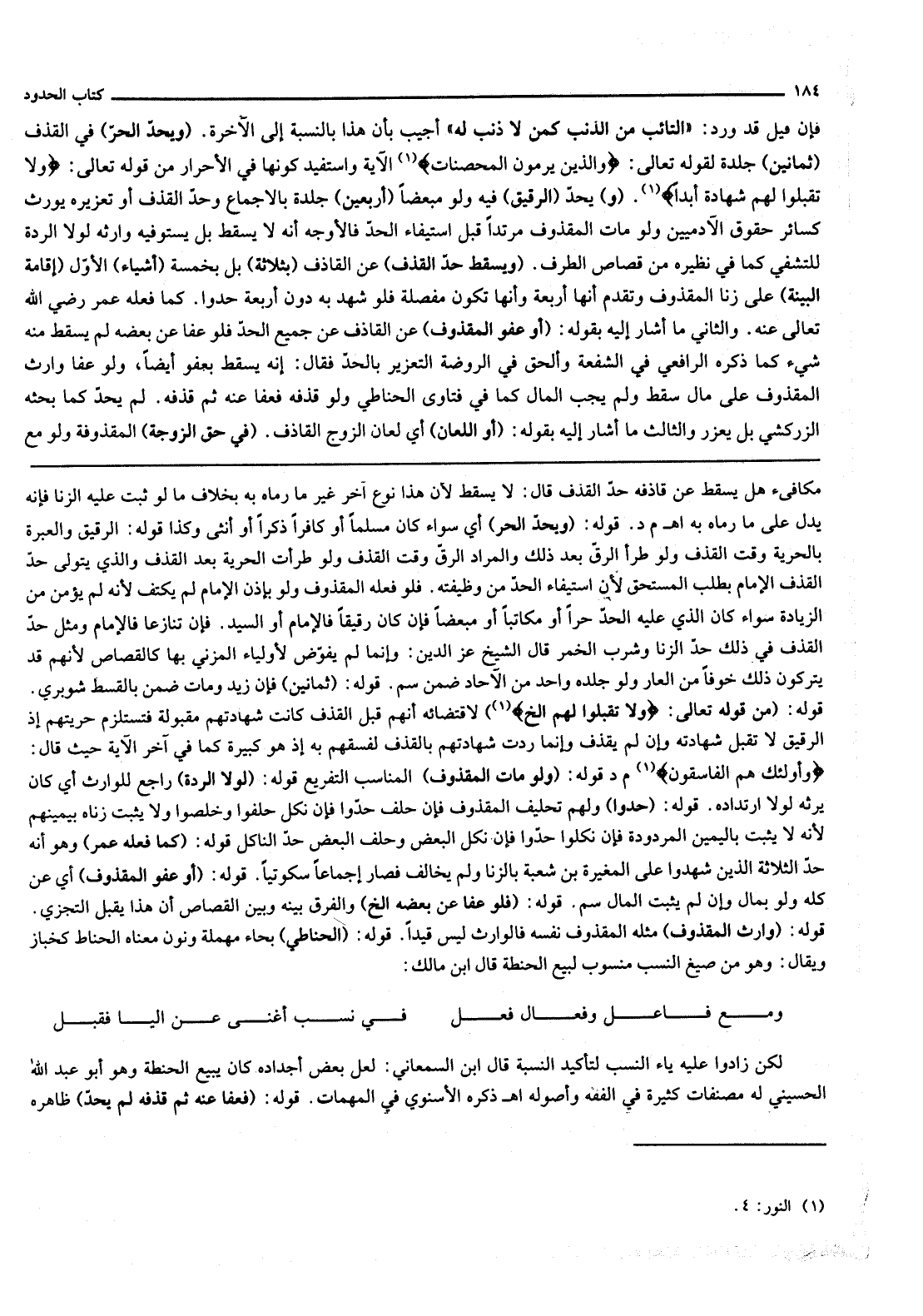 . (وَيُحَدُّ الْحُرُّ) فِي الْقَذْفِ (ثَمَانِينَ) جَلْدَةً لِقَوْلِهِ تَعَالَى: {وَالَّذِينَ يَرْمُونَ الْمُحْصَنَاتِ} [النور: 4] الْآيَةَ وَاسْتُفِيدَ كَوْنُهَا فِي الْأَحْرَارِ مِنْ قَوْله تَعَالَى: {وَلا تَقْبَلُوا لَهُمْ شَهَادَةً أَبَدًا} [النور: 4] . (وَ) يُحَدُّ (الرَّقِيقُ) فِيهِ وَلَوْ مُبَعَّضًا (أَرْبَعِينَ) جَلْدَةً بِالْإِجْمَاعِ.