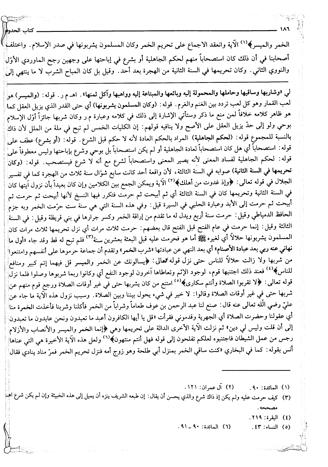 الْآيَةَ وَانْعَقَدَ الْإِجْمَاعُ عَلَى تَحْرِيمِ الْخَمْرِ وَكَانَ الْمُسْلِمُونَ يَشْرَبُونَهَا فِي صَدْرِ الْإِسْلَامِ. وَاخْتَلَفَ أَصْحَابُنَا فِي أَنَّ ذَلِكَ كَانَ اسْتِصْحَابًا مِنْهُمْ لِحُكْمِ الْجَاهِلِيَّةِ أَوْ بِشَرْعٍ فِي إبَاحَتِهَا عَلَى وَجْهَيْنِ رَجَّحَ الْمَاوَرْدِيُّ الْأَوَّلَ وَالنَّوَوِيُّ الثَّانِيَ. وَكَانَ تَحْرِيمُهَا فِي السَّنَةِ الثَّانِيَةِ مِنْ الْهِجْرَةِ بَعْدَ أُحُدٍ. وَقِيلَ: بَلْ كَانَ الْمُبَاحُ الشُّرْبَ لَا مَا يَنْتَهِي إلَى