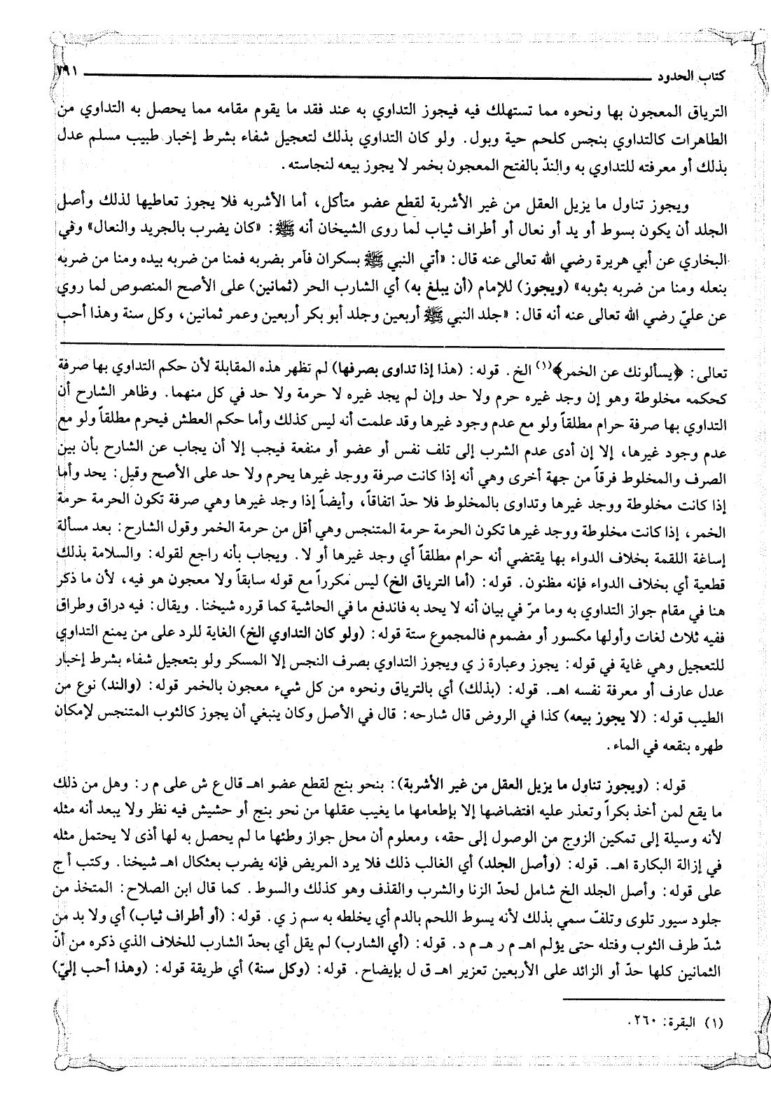 التِّرْيَاقُ الْمَعْجُونُ بِهَا وَنَحْوُهُ مِمَّا تُسْتَهْلَكُ فِيهِ فَيَجُوزُ التَّدَاوِي بِهِ عِنْدَ فَقْدِ مَا يَقُومُ مَقَامَهُ مِمَّا يَحْصُلُ بِهِ التَّدَاوِي مِنْ الطَّاهِرَاتِ كَالتَّدَاوِي بِنَجِسٍ كَلَحْمِ حَيَّةٍ وَبَوْلٍ. وَلَوْ كَانَ التَّدَاوِي بِذَلِكَ لِتَعْجِيلِ شِفَاءٍ بِشَرْطِ إخْبَارِ طَبِيبٍ مُسْلِمٍ عَدْلٍ بِذَلِكَ أَوْ مَعْرِفَتِهِ لِلتَّدَاوِي بِهِ، وَالنَّدُّ بِالْفَتْحِ الْمَعْجُونُ بِخَمْرٍ لَا يَجُوزُ بَيْعُهُ لِنَجَاسَتِهِ.