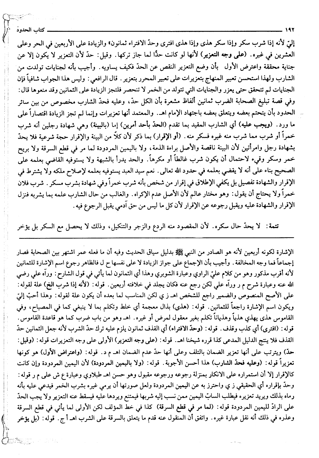 إلَيَّ، لِأَنَّهُ إذَا شَرِبَ سَكِرَ، وَإِذَا سَكِرَ هَذَى، وَإِذَا هَذَى افْتَرَى وَحَدُّ الِافْتِرَاءِ ثَمَانُونَ» وَالزِّيَادَةُ عَلَى الْأَرْبَعِينَ فِي الْحُرِّ وَعَلَى الْعِشْرِينَ فِي غَيْرِهِ. (عَلَى وَجْهِ التَّعْزِيرِ) ، لِأَنَّهَا لَوْ كَانَتْ حَدًّا لَمَا جَازَ تَرْكُهَا. وَقِيلَ: حَدٌّ، لِأَنَّ التَّعْزِيرَ لَا يَكُونُ إلَّا عَنْ جِنَايَةٍ مُحَقَّقَةٍ، وَاعْتُرِضَ الْأَوَّلُ بِأَنَّ وَضْعَ التَّعْزِيرِ النَّقْصُ عَنْ الْحَدِّ فَكَيْفَ يُسَاوِيهِ. وَأُجِيبَ بِأَنَّهُ لِجِنَايَاتٍ تَوَلَّدَتْ مِنْ الشَّارِبِ وَلِهَذَا اُسْتُحْسِنَ تَعْبِيرُ الْمِنْهَاجِ بِتَعْزِيرَاتٍ عَلَى تَعْبِيرِ الْمُحَرَّرِ بِتَعْزِيرٍ. قَالَ الرَّافِعِيُّ: وَلَيْسَ هَذَا الْجَوَابُ شَافِيًا فَإِنَّ الْجِنَايَاتِ لَمْ تَتَحَقَّقْ حَتَّى يُعَزَّرَ، وَالْجِنَايَاتُ الَّتِي تَتَوَلَّدُ مِنْ الْخَمْرِ لَا تَنْحَصِرُ فَلْتَجْزِ الزِّيَادَةُ عَلَى الثَّمَانِينَ وَقَدْ مَنَعُوهَا قَالَ: وَفِي قِصَّةِ تَبْلِيغِ الصَّحَابَةِ الضَّرْبَ ثَمَانِينَ أَلْفَاظٌ مُشْعِرَةٌ بِأَنَّ الْكُلَّ حَدٌّ، وَعَلَيْهِ فَحَدُّ الشَّارِبِ مَخْصُوصٌ مِنْ بَيْنِ سَائِرِ الْحُدُودِ بِأَنْ يَتَحَتَّمَ بَعْضُهُ وَيَتَعَلَّقَ بَعْضُهُ بِاجْتِهَادِ الْإِمَامِ اهـ. وَالْمُعْتَمَدُ أَنَّهَا تَعْزِيرَاتٌ، وَإِنَّمَا لَمْ تُجْزِئْ الزِّيَادَةُ اقْتِصَارًا عَلَى مَا وَرَدَ.