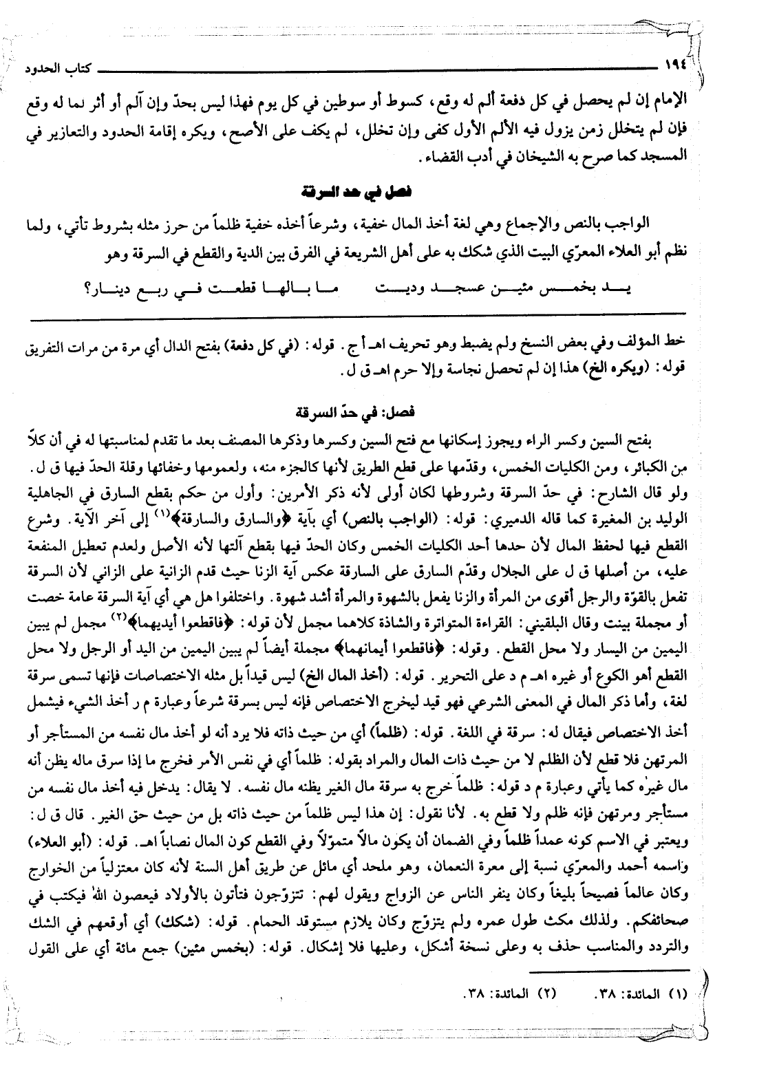 فَصْلٌ فِي حَدِّ السَّرِقَةِ الْوَاجِبُ بِالنَّصِّ وَالْإِجْمَاعِ وَهِيَ لُغَةً أَخْذُ الْمَالِ خِفْيَةً وَشَرْعًا أَخْذُهُ خِفْيَةً ظُلْمًا مِنْ حِرْزِ مِثْلِهِ بِشُرُوطٍ تَأْتِي، وَلَمَّا نَظَمَ أَبُو الْعَلَاءِ الْمَعَرِّيُّ الْبَيْتَ الَّذِي شَكَّكَ بِهِ عَلَى أَهْلِ الشَّرِيعَةِ فِي الْفَرْقِ بَيْنَ الدِّيَةِ وَالْقَطْعِ فِي السَّرِقَةِ وَهُوَ