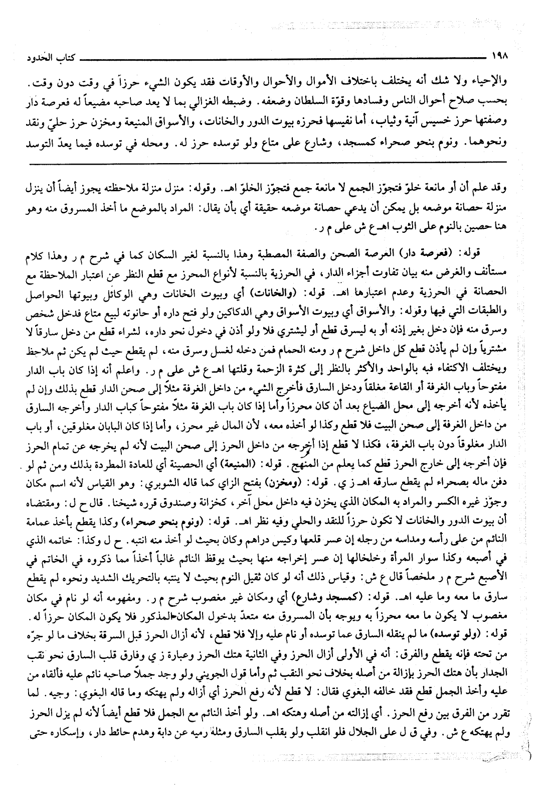 بِحَسَبِ صَلَاحِ أَحْوَالِ النَّاسِ وَفَسَادِهَا وَقُوَّةِ السُّلْطَانِ وَضَعْفِهِ. وَضَبَطَهُ الْغَزَالِيُّ بِمَا لَا يُعَدُّ صَاحِبُهُ مُضَيِّعًا لَهُ؛ فَعَرْصَةُ دَارٍ، وَصُفَّتُهَا حِرْزُ خَسِيسِ آنِيَةٍ وَثِيَابٍ، أَمَّا نَفِيسُهَا فَحِرْزُهُ بُيُوتُ الدُّورِ وَالْخَانَاتِ وَالْأَسْوَاقِ الْمَنِيعَةُ وَمَخْزَنٌ حِرْزُ حُلِيٍّ وَنَقْدٍ وَنَحْوِهِمَا. وَنَوْمٌ بِنَحْوِ صَحْرَاءَ كَمَسْجِدٍ وَشَارِعٍ عَلَى مَتَاعٍ وَلَوْ تَوَسَّدَهُ حِرْزٌ لَهُ. وَمَحَلُّهُ فِي تَوَسُّدِهِ فِيمَا يُعَدُّ التَّوَسُّدُ