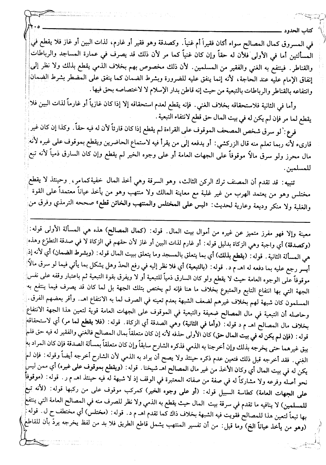 فِي الْمَسْرُوقِ كَمَالِ الْمَصَالِحِ، سَوَاءٌ أَكَانَ فَقِيرًا أَمْ غَنِيًّا وَكَصَدَقَةٍ وَهُوَ فَقِيرٌ أَوْ غَارِمٌ لِذَاتِ الْبَيْنِ أَوْ غَازٍ فَلَا يُقْطَعُ فِي الْمَسْأَلَتَيْنِ أَمَّا فِي الْأُولَى فَلِأَنَّ لَهُ حَقًّا، وَإِنْ كَانَ غَنِيًّا كَمَا مَرَّ، لِأَنَّ ذَلِكَ قَدْ يُصْرَفُ فِي عِمَارَةِ الْمَسَاجِدِ وَالرِّبَاطَاتِ وَالْقَنَاطِرِ فَيَنْتَفِعُ بِهِ الْغَنِيُّ وَالْفَقِيرُ مِنْ الْمُسْلِمِينَ. لِأَنَّ ذَلِكَ مَخْصُوصٌ بِهِمْ بِخِلَافِ الذِّمِّيِّ يُقْطَعُ بِذَلِكَ وَلَا نَظَرَ إلَى إنْفَاقِ الْإِمَامِ عَلَيْهِ عِنْدَ الْحَاجَةِ، لِأَنَّهُ إنَّمَا يُنْفَقُ عَلَيْهِ لِلضَّرُورَةِ وَبِشَرْطِ الضَّمَانِ كَمَا يُنْفَقُ عَلَى الْمُضْطَرِّ بِشَرْطِ الضَّمَانِ وَانْتِفَاعُهُ بِالْقَنَاطِرِ وَالرِّبَاطَاتِ بِالتَّبَعِيَّةِ مِنْ حَيْثُ إنَّهُ قَاطِنٌ بِدَارِ الْإِسْلَامِ لَا لِاخْتِصَاصِهِ بِحَقٍّ فِيهَا. وَأَمَّا فِي الثَّانِيَةِ فَلِاسْتِحْقَاقِهِ بِخِلَافِ الْغَنِيِّ. فَإِنَّهُ يُقْطَعُ لِعَدَمِ اسْتِحْقَاقِهِ إلَّا إذَا كَانَ غَازِيًا، أَوْ غَارِمًا لِذَاتِ الْبَيْنِ فَلَا يُقْطَعُ لِمَا مَرَّ فَإِنْ لَمْ يَكُنْ لَهُ فِي بَيْتِ الْمَالِ حَقٌّ قُطِعَ لِانْتِفَاءِ التَّبَعِيَّةِ.