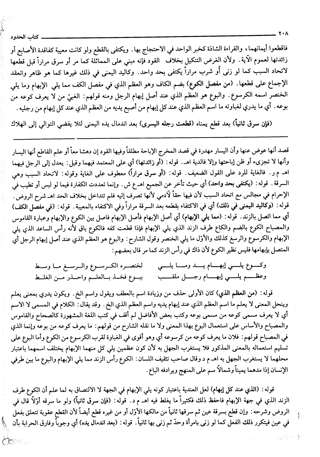 فَاقْطَعُوا أَيْمَانَهُمَا، وَالْقِرَاءَةُ الشَّاذَّةُ كَخَبَرِ الْوَاحِدِ فِي الِاحْتِجَاجِ بِهَا. وَيُكْتَفَى بِالْقَطْعِ وَلَوْ كَانَتْ مَعِيبَةً كَفَاقِدَةِ الْأَصَابِعِ أَوْ زَائِدَتِهَا لِعُمُومِ الْآيَةِ. وَلِأَنَّ الْغَرَضَ التَّنْكِيلُ بِخِلَافِ الْقَوَدِ فَإِنَّهُ مَبْنِيٌّ عَلَى الْمُمَاثَلَةِ كَمَا مَرَّ، أَوْ سَرَقَ مِرَارًا قَبْلَ قَطْعِهَا لِاتِّحَادِ السَّبَبِ كَمَا لَوْ زَنَى، أَوْ شَرِبَ مِرَارًا يُكْتَفَى بِحَدٍّ وَاحِدٍ. وَكَالْيَدِ الْيُمْنَى فِي ذَلِكَ غَيْرُهَا كَمَا هُوَ ظَاهِرٌ وَانْعَقَدَ الْإِجْمَاعُ عَلَى قَطْعِهَا. (مِنْ مَفْصِلِ الْكُوعِ) بِضَمِّ الْكَافِ وَهُوَ الْعَظْمُ الَّذِي فِي مَفْصِلِ الْكَفِّ مِمَّا يَلِي الْإِبْهَامَ وَمَا يَلِي الْخِنْصَرَ اسْمُهُ الْكُرْسُوعُ.