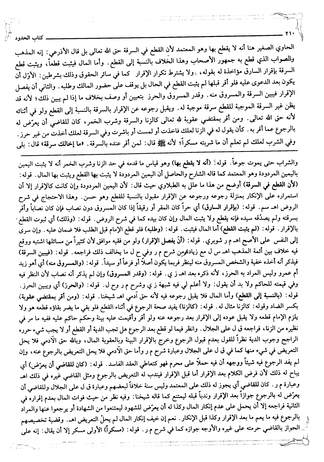 قَوْلُهُ: (كَالزِّنَا) يُفِيدُ صِحَّةَ الرُّجُوعِ فِي أَثْنَاءِ الْقَطْعِ فَلَوْ بَقِيَ مَا يَضُرُّ بَقَاؤُهُ قَطَعَهُ هُوَ وَلَا يَلْزَمُ الْإِمَامَ قَطْعُهُ وَلَا يُقْبَلُ عَوْدُهُ إلَى الْإِقْرَارِ بَعْدَ رُجُوعِهِ عَنْهُ وَلَوْ أَقَرَّ وَأُقِيمَتْ عَلَيْهِ بَيِّنَةٌ وَحَكَمَ حَاكِمٌ عَلَيْهِ فَفِيهِ مَا مَرَّ فِي نَظِيرِهِ مِنْ الزِّنَا، فَرَاجِعْهُ ق ل عَلَى الْجَلَالِ. وَانْظُرْ فِيمَا لَوْ قَطَعَ بَعْدَ الرُّجُوعِ هَلْ تَجِبُ الدِّيَةُ، أَوْ الْقَطْعُ، أَوْ لَا يَجِبُ شَيْءٌ حَرِّرْهُ الرَّاجِحُ وُجُوبُ الدِّيَةِ نَظَرًا لِلْقَوْلِ بِعَدَمِ قَبُولِ الرُّجُوعِ وَخَرَجَ بِالْإِقْرَارِ الْبَيِّنَةُ وَبِالْعُقُوبَةِ الْمَالُ، وَبِاَللَّهِ حَقُّ الْآدَمِيِّ فَلَا يَحِلُّ التَّعْرِيضُ فِي شَيْءٍ مِنْهَا كَمَا فِي ق ل عَلَى الْجَلَالِ وَعِبَارَةُ شَرْحٍ م ر، وَأَمَّا حَقُّ الْآدَمِيِّ فَلَا يَحِلُّ التَّعْرِيضُ بِالرُّجُوعِ عَنْهُ، وَإِنْ لَمْ يُفِدْ الرُّجُوعُ فِيهِ شَيْئًا وَوَجْهُهُ أَنَّ فِيهِ حَمْلًا عَلَى مُحَرَّمٍ فَهُوَ كَتَعَاطِي الْعَقْدِ الْفَاسِدِ.