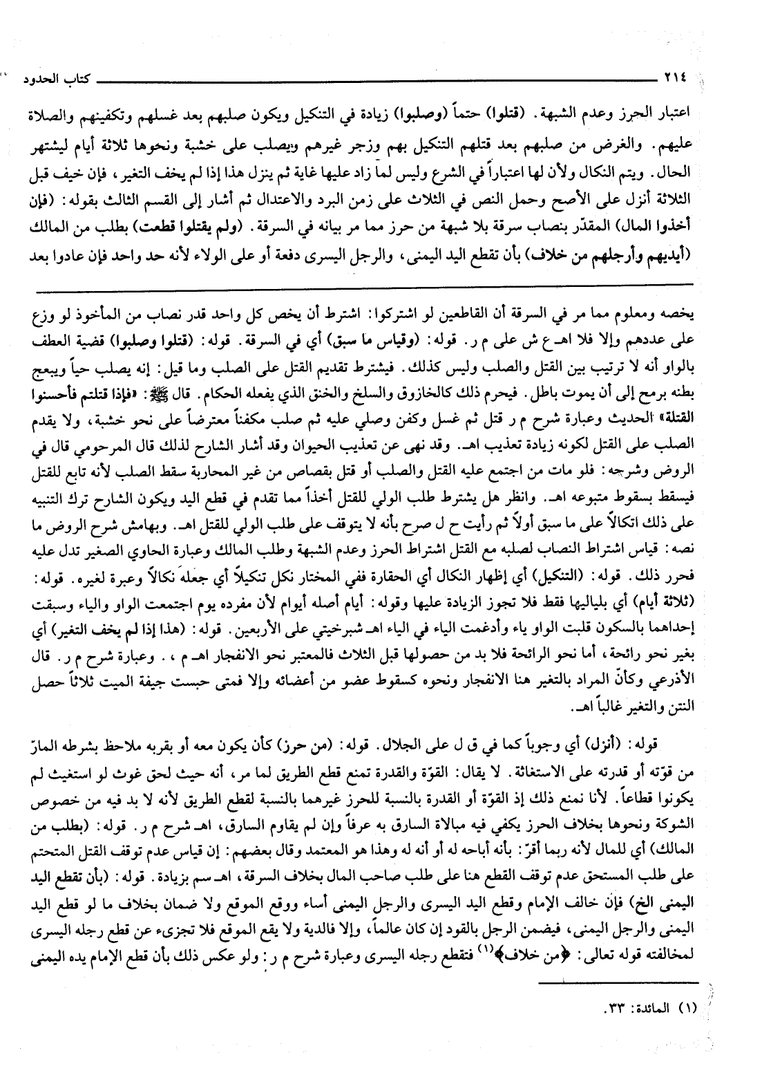 اعْتِبَارُ الْحِرْزِ وَعَدَمِ الشُّبْهَةِ. (قُتِلُوا) حَتْمًا (وَصُلِبُوا) زِيَادَةً فِي التَّنْكِيلِ وَيَكُونُ صَلْبُهُمْ بَعْدَ غُسْلِهِمْ وَتَكْفِينِهِمْ وَالصَّلَاةِ عَلَيْهِمْ. وَالْغَرَضُ مِنْ صَلْبِهِمْ بَعْدَ قَتْلِهِمْ التَّنْكِيلُ بِهِمْ وَزَجْرُ غَيْرِهِمْ وَيُصْلَبُ عَلَى خَشَبَةٍ وَنَحْوِهَا ثَلَاثَةَ أَيَّامٍ لِيَشْتَهِرَ الْحَالُ. وَيَتِمَّ النَّكَالُ وَلِأَنَّ لَهَا اعْتِبَارًا فِي الشَّرْعِ وَلَيْسَ لِمَا زَادَ عَلَيْهَا غَايَةٌ ثُمَّ يَنْزِلُ هَذَا إذَا لَمْ يُخَفْ التَّغَيُّرُ، فَإِنْ خِيفَ قَبْلَ الثَّلَاثَةِ أُنْزِلَ عَلَى الْأَصَحِّ وَحُمِلَ النَّصُّ فِي الثَّلَاثِ عَلَى زَمَنِ الْبَرْدِ وَالِاعْتِدَالِ