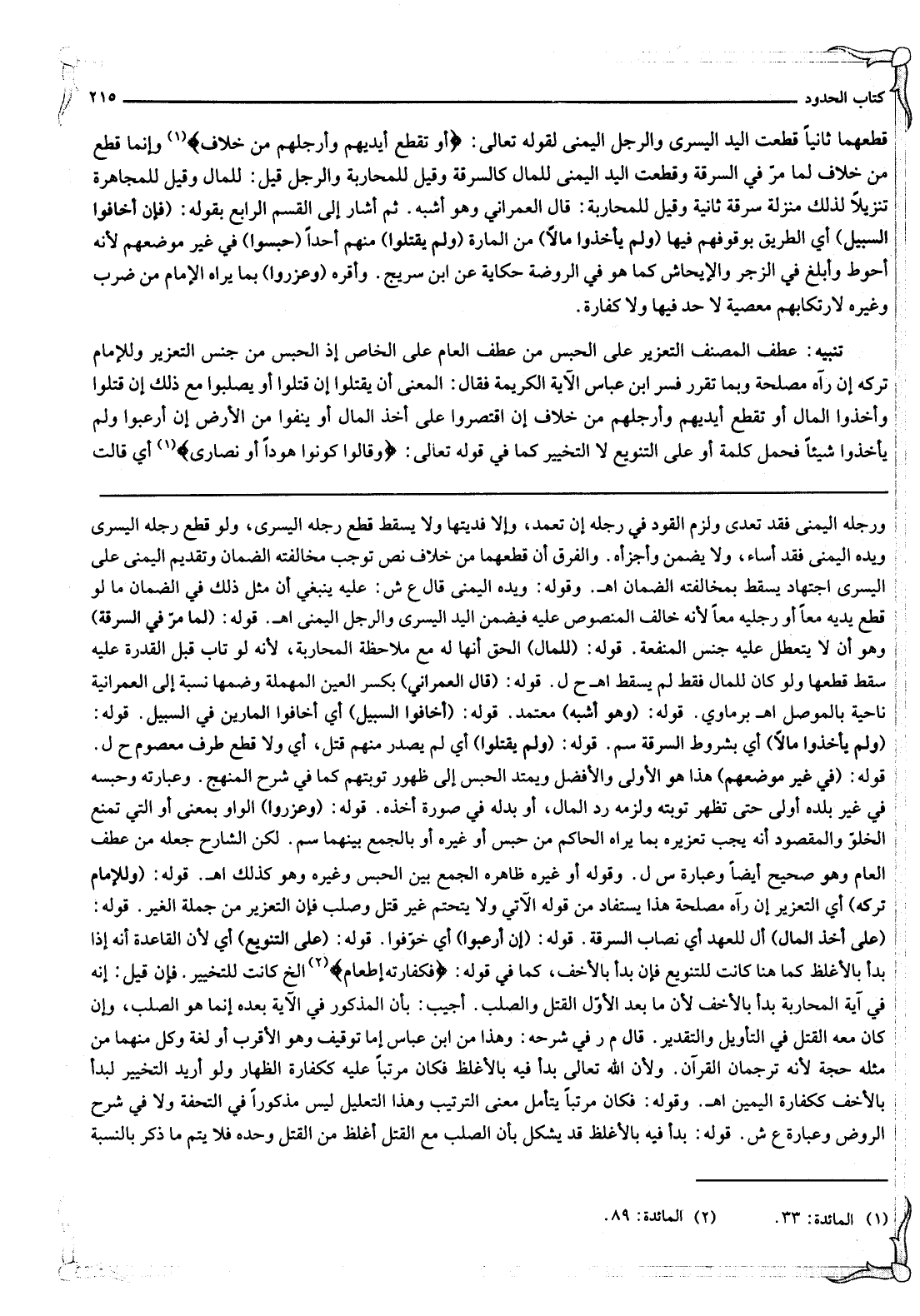 وَبِمَا تَقَرَّرَ فَسَّرَ ابْنُ عَبَّاسٍ الْآيَةَ الْكَرِيمَةَ فَقَالَ: الْمَعْنَى أَنْ يُقَتَّلُوا إنْ قَتَلُوا أَوْ يُصَلَّبُوا مَعَ ذَلِكَ إنْ قَتَلُوا وَأَخَذُوا الْمَالَ أَوْ تُقَطَّعَ أَيْدِيهِمْ وَأَرْجُلُهُمْ مِنْ خِلَافٍ إنْ اقْتَصَرُوا عَلَى أَخْذِ الْمَالِ أَوْ يُنْفَوْا مِنْ الْأَرْضِ إنْ أَرْعَبُوا وَلَمْ يَأْخُذُوا شَيْئًا فَحَمَلَ كَلِمَةَ أَوْ عَلَى التَّنْوِيعِ لَا التَّخْيِيرِ كَمَا فِي قَوْله تَعَالَى: {وَقَالُوا كُونُوا هُودًا أَوْ نَصَارَى} [البقرة: 135] أَيْ قَالَتْ