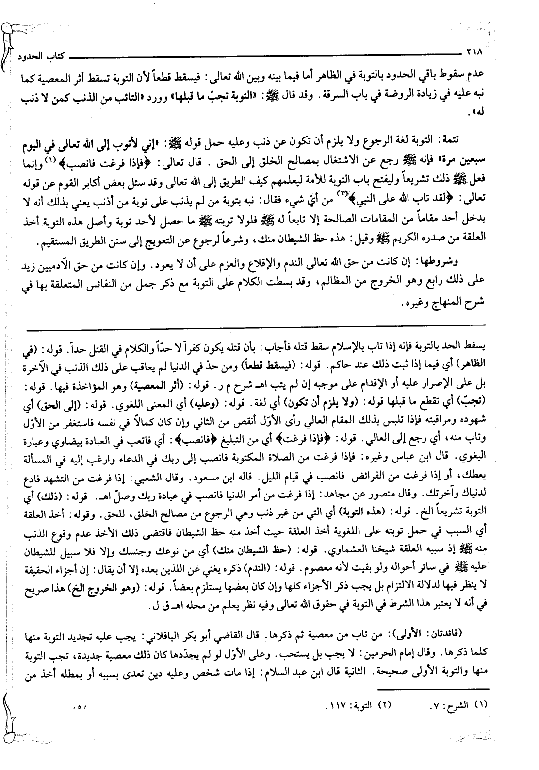تَتِمَّةٌ: التَّوْبَةُ لُغَةً الرُّجُوعُ وَلَا يَلْزَمُ أَنْ تَكُونَ عَنْ ذَنْبٍ وَعَلَيْهِ حُمِلَ قَوْلُهُ - صَلَّى اللَّهُ عَلَيْهِ وَسَلَّمَ -: «إنِّي لَأَتُوبُ إلَى اللَّهِ تَعَالَى فِي الْيَوْمِ سَبْعِينَ مَرَّةً» فَإِنَّهُ - صَلَّى اللَّهُ عَلَيْهِ وَسَلَّمَ - رَجَعَ عَنْ الِاشْتِغَالِ بِمَصَالِحِ الْخَلْقِ إلَى الْحَقِّ. قَالَ تَعَالَى: {فَإِذَا فَرَغْتَ فَانْصَبْ} [الشرح: 7] وَإِنَّمَا فَعَلَ - صَلَّى اللَّهُ عَلَيْهِ وَسَلَّمَ - ذَلِكَ تَشْرِيعًا وَلِيَفْتَحَ بَابَ التَّوْبَةِ لِلْأُمَّةِ لِيُعَلِّمَهُمْ كَيْفَ الطَّرِيقُ إلَى اللَّهِ تَعَالَى وَقَدْ سُئِلَ بَعْضُ أَكَابِرِ الْقَوْمِ عَنْ قَوْله تَعَالَى: {لَقَدْ تَابَ اللَّهُ عَلَى النَّبِيِّ} [التوبة: 117] مِنْ أَيِّ شَيْءٍ فَقَالَ: نَبَّهَ بِتَوْبَةِ مَنْ لَمْ يُذْنِبْ عَلَى تَوْبَةِ مَنْ أَذْنَبَ يَعْنِي بِذَلِكَ أَنَّهُ لَا يَدْخُلُ أَحَدٌ مَقَامًا مِنْ الْمَقَامَاتِ الصَّالِحَةِ إلَّا تَابِعًا لَهُ - صَلَّى اللَّهُ عَلَيْهِ وَسَلَّمَ - فَلَوْلَا تَوْبَتُهُ - صَلَّى اللَّهُ عَلَيْهِ وَسَلَّمَ - مَا حَصَلَ لِأَحَدٍ تَوْبَةٌ، وَأَصْلُ هَذِهِ التَّوْبَةِ أَخْذُ الْعَلَقَةِ مِنْ صَدْرِهِ الْكَرِيمِ - صَلَّى اللَّهُ عَلَيْهِ وَسَلَّمَ - وَقِيلَ: هَذِهِ حَظُّ الشَّيْطَانِ مِنْك، وَشَرْعًا الرُّجُوعُ عَنْ التَّعْوِيجِ إلَى سُنَنِ الطَّرِيقِ الْمُسْتَقِيمِ.