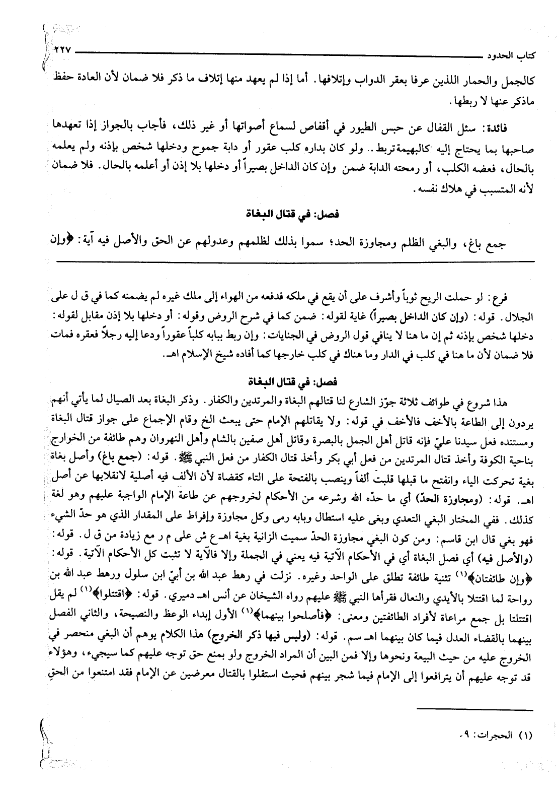 فَصْلٌ: فِي قِتَالِ الْبُغَاةِ جَمْعُ بَاغٍ وَالْبَغْيُ الظُّلْمُ وَمُجَاوَزَةُ الْحَدِّ سُمُّوا بِذَلِكَ لِظُلْمِهِمْ وَعُدُولِهِمْ عَنْ الْحَقِّ وَالْأَصْلُ فِيهِ آيَةُ: {وَإِنْ طَائِفَتَانِ مِنَ الْمُؤْمِنِينَ اقْتَتَلُوا} [الحجرات: 9]