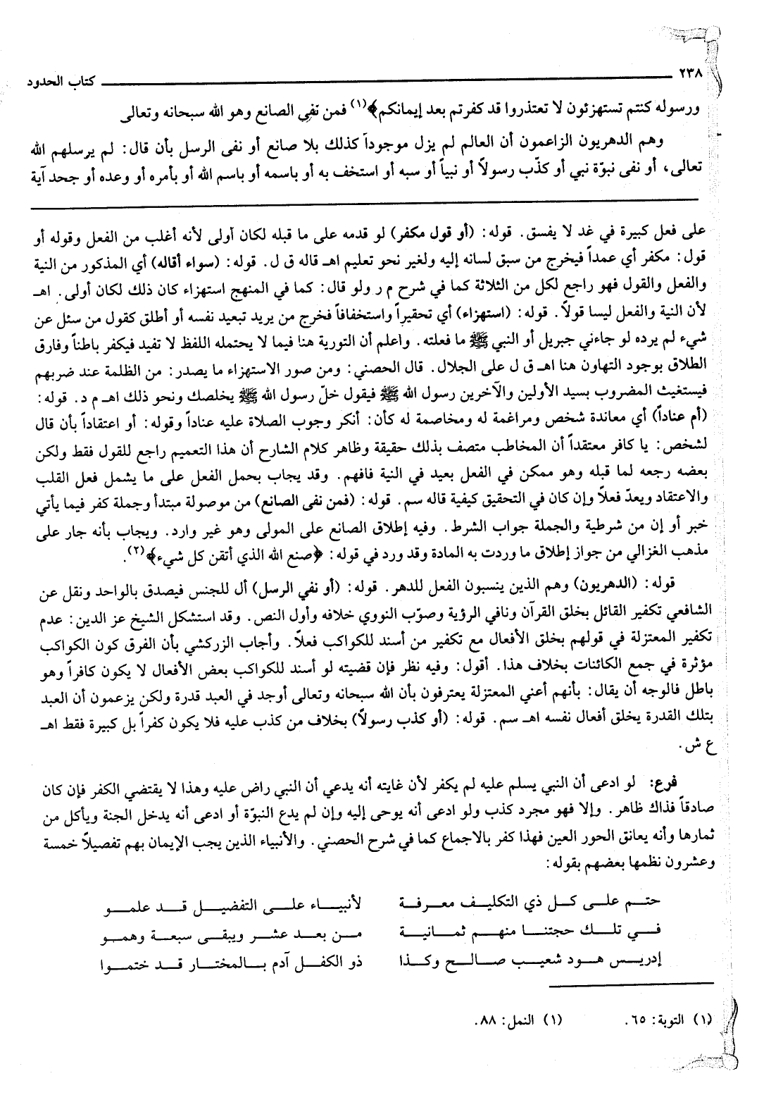 قَوْلُهُ: (أَوْ نَفَى الرُّسُلَ) أَلْ لِلْجِنْسِ فَيَصْدُقُ بِالْوَاحِدِ وَنُقِلَ عَنْ الشَّافِعِيِّ تَكْفِيرُ الْقَائِلِ بِخَلْقِ الْقُرْآنِ وَنَافِي الرُّؤْيَةِ وَصَوَّبَ النَّوَوِيُّ خِلَافَهُ وَأَوَّلَ النَّصَّ. وَقَدْ اسْتَشْكَلَ الشَّيْخُ عِزُّ الدِّينِ: عَدَمَ تَكْفِيرِ الْمُعْتَزِلَةِ فِي قَوْلِهِمْ بِخَلْقِ الْأَفْعَالِ مَعَ تَكْفِيرِ مَنْ أَسْنَدَ لِلْكَوَاكِبِ فِعْلًا. وَأَجَابَ الزَّرْكَشِيّ بِأَنَّ الْفَرْقَ كَوْنُ الْكَوَاكِبِ مُؤَثِّرَةً فِي جَمْعِ الْكَائِنَاتِ بِخِلَافِ هَذَا. أَقُولُ: وَفِيهِ نَظَرٌ فَإِنَّ قَضِيَّتَهُ لَوْ أَسْنَدَ لِلْكَوَاكِبِ بَعْضَ الْأَفْعَالِ لَا يَكُونُ كَافِرًا وَهُوَ بَاطِلٌ فَالْوَجْهُ أَنْ يُقَالَ: بِأَنَّهُمْ أَعْنِي الْمُعْتَزِلَةَ يَعْتَرِفُونَ بِأَنَّ اللَّهَ سُبْحَانَهُ وَتَعَالَى أَوْجَدَ فِي الْعَبْدِ قُدْرَةً وَلَكِنْ يَزْعُمُونَ أَنَّ الْعَبْدَ بِتِلْكَ الْقُدْرَةِ يَخْلُقُ أَفْعَالَ نَفْسِهِ اهـ سم.