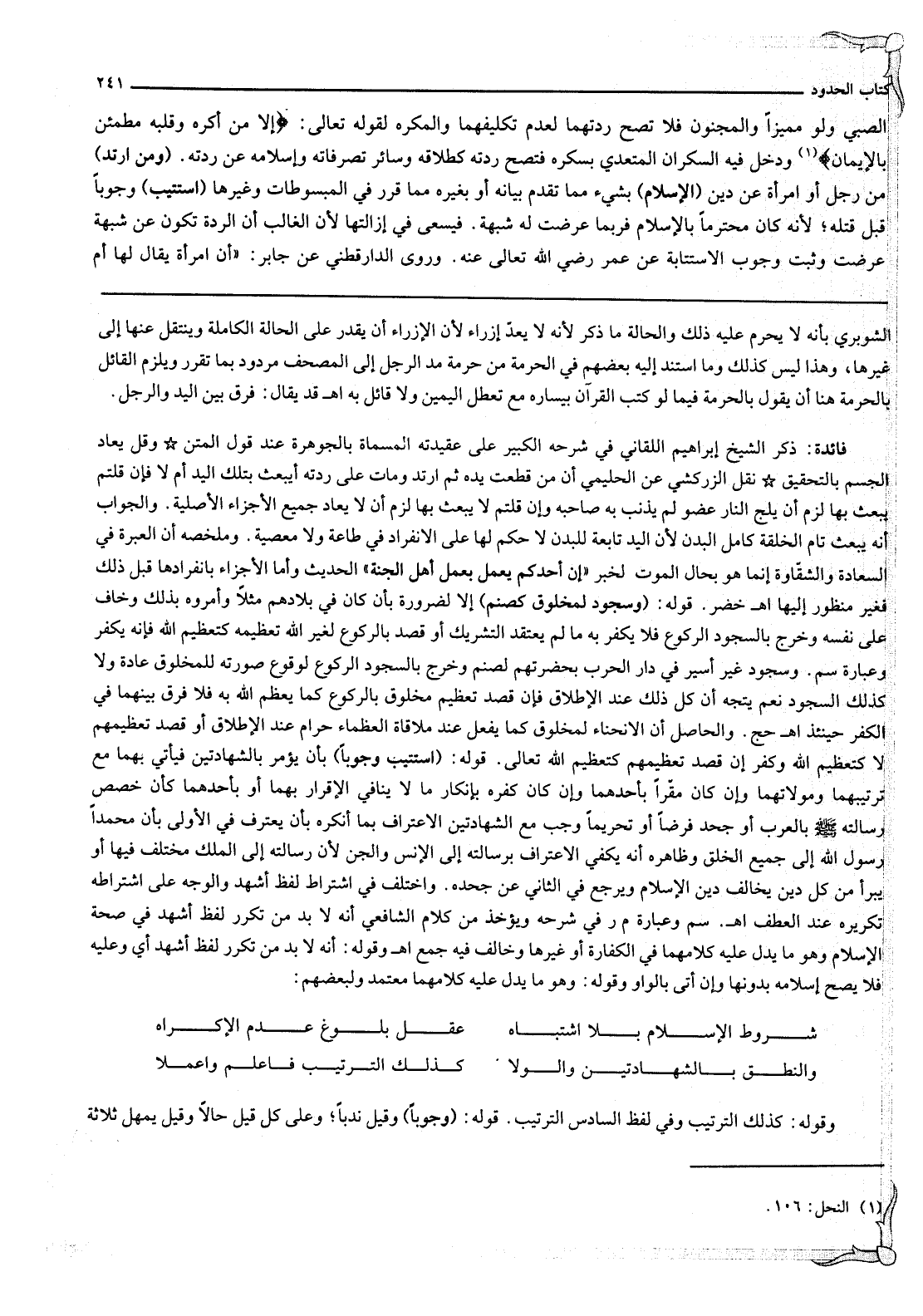 وَالنُّطْقُ بِالشَّهَادَتَيْنِ وَالَوْلَا ... كَذَلِكَ التَّرْتِيبُ فَاعْلَمْ وَاعْمَلَا