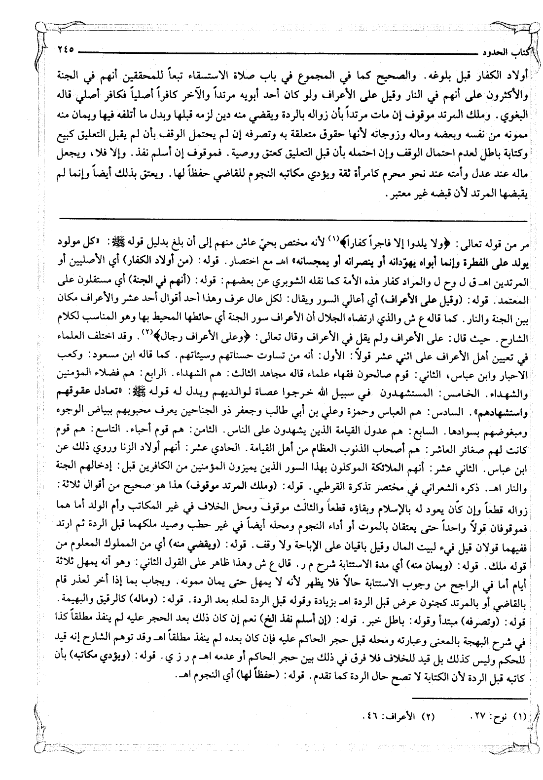 قَوْلُهُ: (وَقِيلَ عَلَى الْأَعْرَافِ) أَيْ أَعَالِي السُّورِ وَيُقَالُ: لِكُلِّ عَالٍ عُرْفٌ وَهَذَا أَحَدُ أَقْوَالٍ أَحَدَ عَشَرَ وَالْأَعْرَافُ مَكَانٌ بَيْنَ الْجَنَّةِ وَالنَّارِ. كَمَا قَالَهُ ع ش وَاَلَّذِي ارْتَضَاهُ الْجَلَالُ أَنَّ الْأَعْرَافَ سُورُ الْجَنَّةِ أَيْ حَائِطُهَا الْمُحِيطُ بِهَا وَهُوَ الْمُنَاسِبُ لِكَلَامِ الشَّارِحِ حَيْثُ قَالَ عَلَى الْأَعْرَافِ وَلَمْ يَقُلْ فِي الْأَعْرَافِ وَقَالَ تَعَالَى {وَعَلَى الأَعْرَافِ رِجَالٌ} [الأعراف: 46] . قَدْ اخْتَلَفَ الْعُلَمَاءُ فِي تَعْيِينِ أَهْلِ الْأَعْرَافِ عَلَى اثْنَيْ عَشَرَ قَوْلًا: الْأَوَّلُ: أَنَّهُ مَنْ تَسَاوَتْ حَسَنَاتُهُمْ وَسَيِّئَاتُهُمْ. كَمَا قَالَهُ ابْنُ مَسْعُودٍ: وَكَعْبُ الْأَحْبَارِ وَابْنُ عَبَّاسٍ، الثَّانِي: قَوْمٌ صَالِحُونَ فُقَهَاءُ عُلَمَاءُ قَالَهُ مُجَاهِدٌ الثَّالِثُ: هُمْ الشُّهَدَاءُ. الرَّابِعُ: هُمْ فُضَلَاءُ الْمُؤْمِنِينَ وَالشُّهَدَاءُ. الْخَامِسُ: الْمُسْتَشْهِدُونَ فِي سَبِيلِ اللَّهِ خَرَجُوا عُصَاةً لِوَالِدَيْهِمْ وَيَدُلُّ لَهُ قَوْلُهُ - صَلَّى اللَّهُ عَلَيْهِ وَسَلَّمَ -: «تَعَادَلَ عُقُوقُهُمْ وَاسْتِشْهَادُهُمْ» . السَّادِسُ: هُمْ الْعَبَّاسُ وَحَمْزَةُ وَعَلِيُّ بْنُ أَبِي طَالِبٍ وَجَعْفَرٌ ذُو الْجَنَاحَيْنِ يُعْرَفُ مَحْبُوبُهُمْ بِبَيَاضِ الْوُجُوهِ وَمَبْغُوضُهُمْ بِسَوَادِهَا.