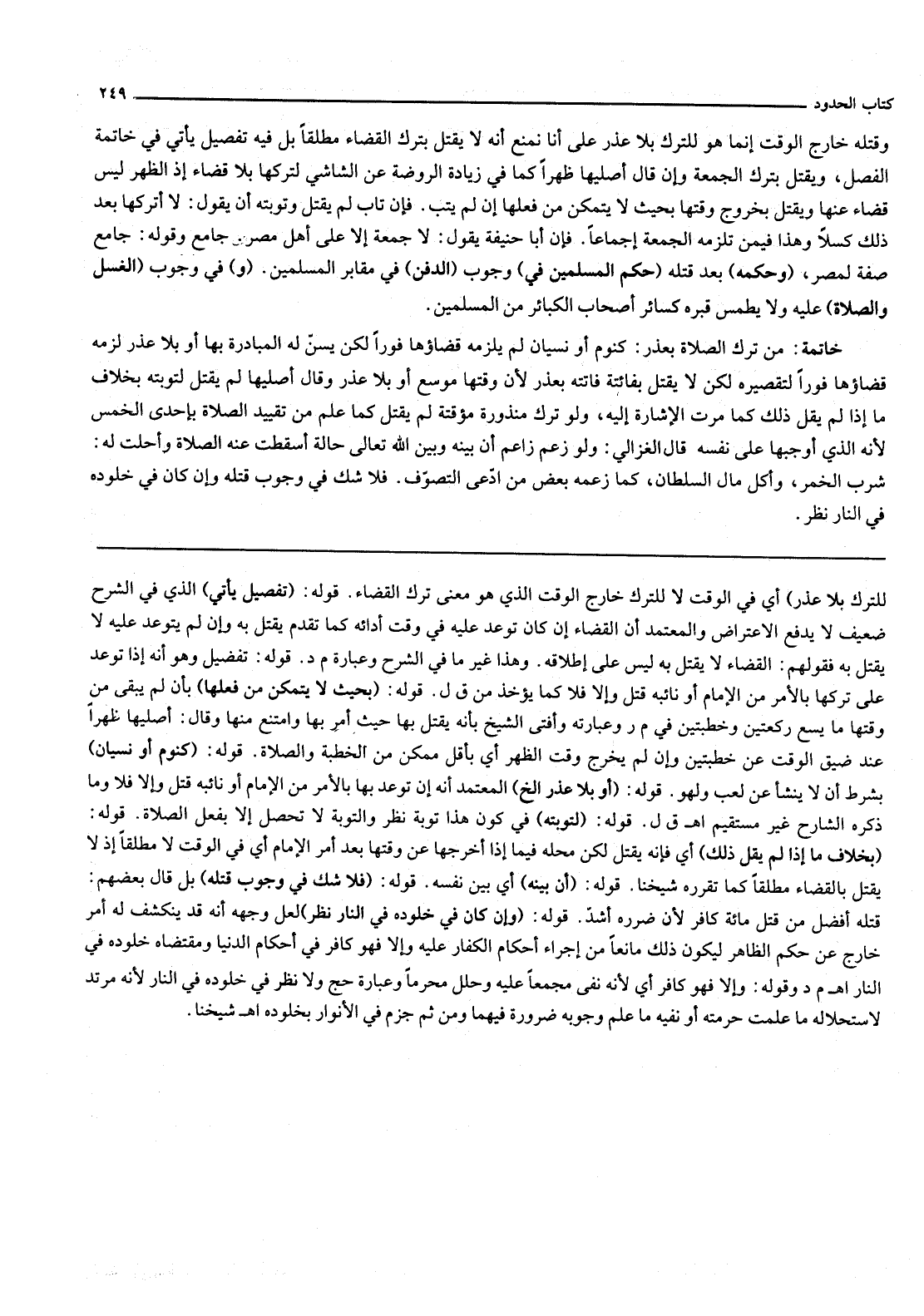 وَقَتْلُهُ خَارِجَ الْوَقْتِ إنَّمَا هُوَ لِلتَّرْكِ بِلَا عُذْرٍ عَلَى أَنَّا نَمْنَعُ أَنَّهُ لَا يُقْتَلُ بِتَرْكِ الْقَضَاءِ مُطْلَقًا بَلْ فِيهِ تَفْصِيلٌ يَأْتِي فِي خَاتِمَةِ الْفَصْلِ.