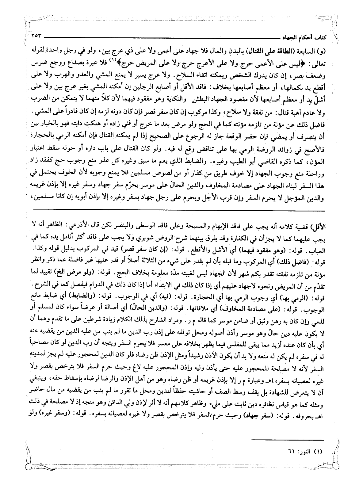 (وَ) السَّابِعَةُ (الطَّاقَةُ عَلَى الْقِتَالِ) بِالْبَدَنِ وَالْمَالِ فَلَا جِهَادَ عَلَى أَعْمَى وَلَا عَلَى ذِي عَرَجٍ بَيِّنٍ، وَلَوْ فِي رِجْلٍ وَاحِدَةٍ لِقَوْلِهِ تَعَالَى: {لَيْسَ عَلَى الأَعْمَى حَرَجٌ وَلا عَلَى الأَعْرَجِ حَرَجٌ وَلا عَلَى الْمَرِيضِ حَرَجٌ} [الفتح: 17] فَلَا عِبْرَةَ بِصُدَاعٍ وَوَجَعِ ضِرْسٍ وَضَعْفِ بَصَرٍ، إنْ كَانَ يُدْرِكُ الشَّخْصَ وَيُمْكِنُهُ اتِّقَاءَ السِّلَاحِ. وَلَا عَرَجٍ يَسِيرٍ لَا يَمْنَعُ الْمَشْيَ وَالْعَدْوَ وَالْهَرَبَ وَلَا عَلَى أَقْطَعِ يَدٍ بِكَمَالِهَا، أَوْ مُعْظَمِ أَصَابِعِهَا بِخِلَافِ: فَاقِدِ الْأَقَلِّ أَوْ أَصَابِعِ الرِّجْلَيْنِ إنْ أَمْكَنَهُ الْمَشْيُ بِغَيْرِ عَرَجٍ بَيِّنٍ وَلَا عَلَى أَشَلِّ يَدٍ أَوْ مُعْظَمِ أَصَابِعِهَا لِأَنَّ مَقْصُودَ الْجِهَادِ الْبَطْشُ وَالنِّكَايَةُ وَهُوَ مَفْقُودٌ فِيهِمَا لِأَنَّ كُلًّا مِنْهُمَا لَا يَتَمَكَّنُ مِنْ الضَّرْبِ، وَلَا عَادِمٍ أُهْبَةَ قِتَالٍ: مِنْ نَفَقَةٍ وَلَا سِلَاحٍ، وَكَذَا مَرْكُوبٌ إنْ كَانَ سَفَرَ قَصْرٍ فَإِنْ كَانَ دُونَهُ لَزِمَهُ إنْ كَانَ قَادِرًا عَلَى الْمَشْيِ