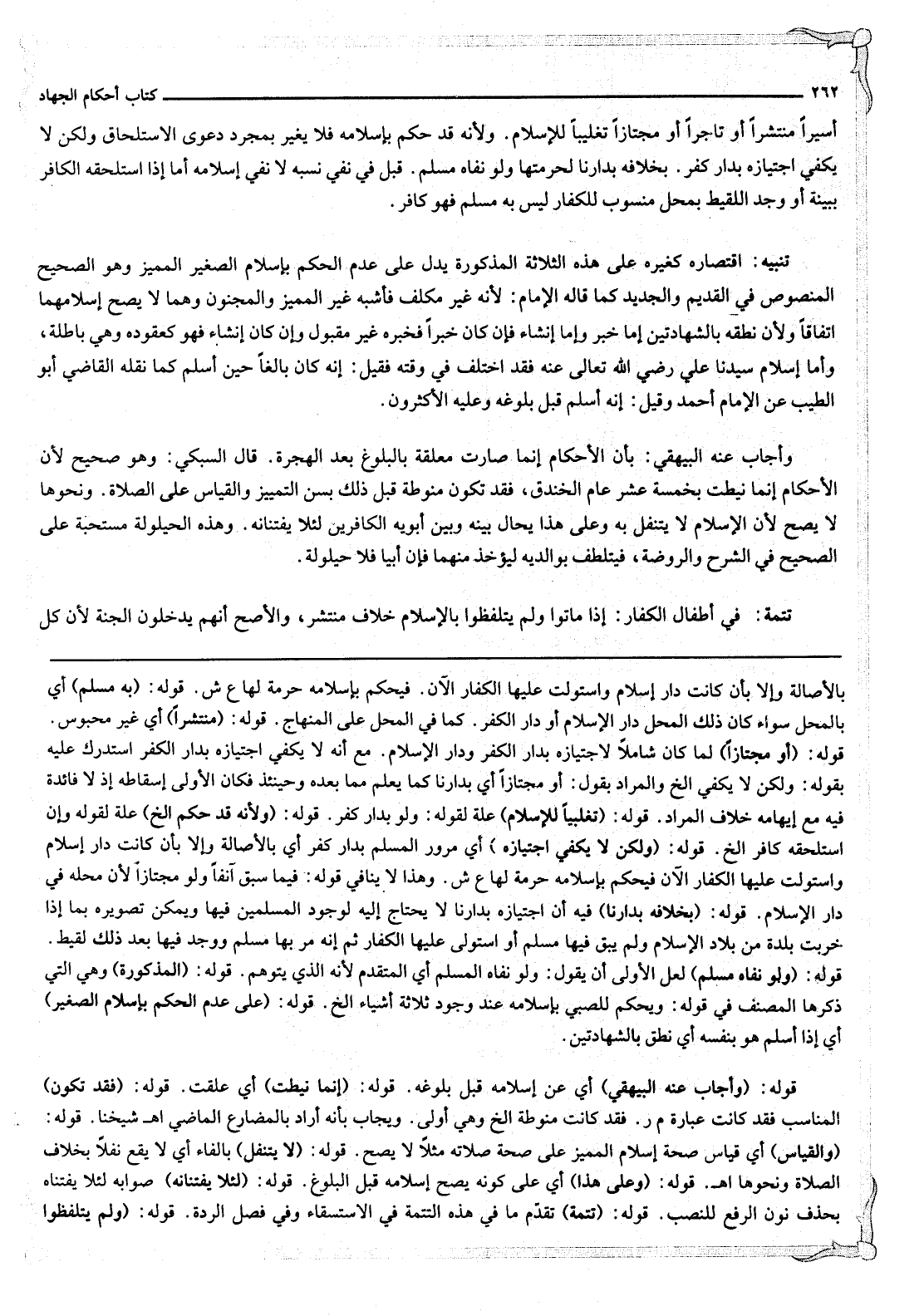 أَسِيرًا مُنْتَشِرًا أَوْ تَاجِرًا أَوْ مُجْتَازًا تَغْلِيبًا لِلْإِسْلَامِ. وَلِأَنَّهُ قَدْ حُكِمَ بِإِسْلَامِهِ فَلَا يُغَيَّرُ بِمُجَرَّدِ دَعْوَى الِاسْتِلْحَاقِ وَلَكِنْ لَا يَكْفِي اجْتِيَازُهُ بِدَارِ كُفْرٍ. بِخِلَافِهِ بِدَارِنَا لِحُرْمَتِهَا وَلَوْ نَفَاهُ مُسْلِمٌ. قُبِلَ فِي نَفْيِ نَسَبه لَا نَفْيِ إسْلَامِهِ أَمَّا إذَا اسْتَلْحَقَهُ الْكَافِرُ بِبَيِّنَةٍ أَوْ وُجِدَ اللَّقِيطُ بِمَحَلٍّ مَنْسُوبٍ لِلْكُفَّارِ لَيْسَ بِهِ مُسْلِمٌ فَهُوَ كَافِرٌ. تَنْبِيهٌ اقْتِصَارُهُ كَغَيْرِهِ عَلَى هَذِهِ الثَّلَاثَةِ الْمَذْكُورَةِ يَدُلُّ عَلَى عَدَمِ الْحُكْمِ بِإِسْلَامِ الصَّغِيرِ الْمُمَيِّزِ وَهُوَ الصَّحِيحُ الْمَنْصُوصُ فِي الْقَدِيمِ وَالْجَدِيدِ كَمَا قَالَهُ الْإِمَامُ: لِأَنَّهُ غَيْرُ مُكَلَّفٍ فَأَشْبَهَ غَيْرَ الْمُمَيِّزِ وَالْمَجْنُونَ وَهُمَا لَا يَصِحُّ إسْلَامُهُمَا اتِّفَاقًا وَلِأَنَّ نُطْقَهُ بِالشَّهَادَتَيْنِ إمَّا خَبَرٌ وَإِمَّا إنْشَاءٌ، فَإِنْ كَانَ خَبَرًا فَخَبَرُهُ غَيْرُ مَقْبُولٍ وَإِنْ كَانَ إنْشَاءً فَهُوَ كَعُقُودِهِ وَهِيَ بَاطِلَةٌ، وَأَمَّا إسْلَامُ سَيِّدِنَا عَلِيٍّ - رَضِيَ اللَّهُ تَعَالَى عَنْهُ - فَقَدْ اُخْتُلِفَ فِي وَقْتِهِ فَقِيلَ: إنَّهُ كَانَ بَالِغًا حِينَ أَسْلَمَ كَمَا نَقَلَهُ الْقَاضِي أَبُو الطَّيِّبِ عَنْ الْإِمَامِ أَحْمَدَ وَقِيلَ: إنَّهُ أَسْلَمَ قَبْلَ بُلُوغِهِ وَعَلَيْهِ الْأَكْثَرُونَ.