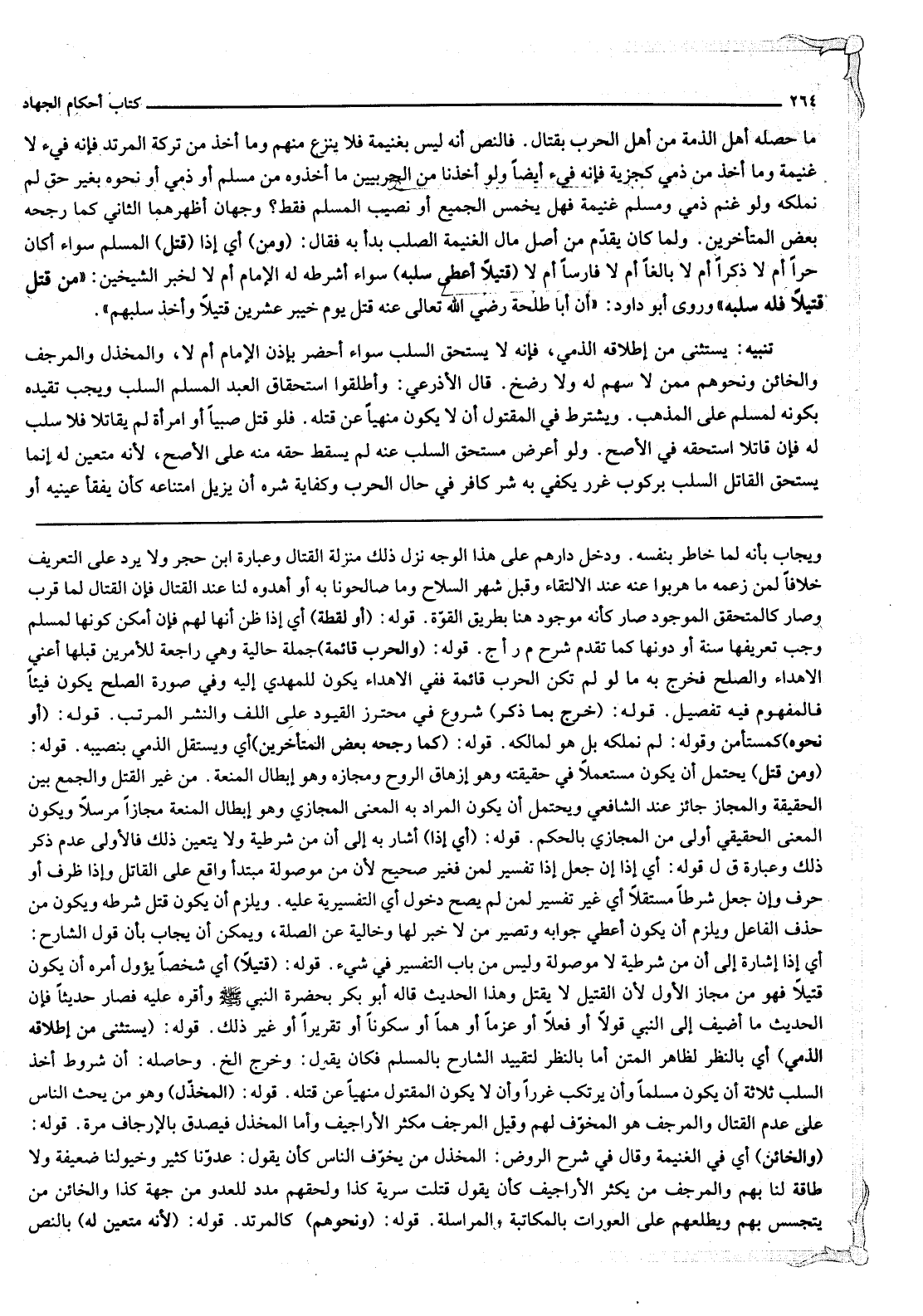 مَا حَصَّلَهُ أَهْلُ الذِّمَّةِ مِنْ أَهْلِ الْحَرْبِ بِقِتَالٍ فَالنَّصُّ أَنَّهُ لَيْسَ بِغَنِيمَةٍ فَلَا يُنْزَعُ مِنْهُمْ وَمَا أُخِذَ مِنْ تَرِكَةِ الْمُرْتَدِّ فَإِنَّهُ فَيْءٌ لَا غَنِيمَةٌ وَمَا أُخِذَ مِنْ ذِمِّيٍّ كَجِزْيَةٍ فَإِنَّهُ فَيْءٌ أَيْضًا وَلَوْ أَخَذْنَا مِنْ الْحَرْبِيِّينَ مَا أَخَذُوهُ مِنْ مُسْلِمٍ أَوْ ذِمِّيٍّ أَوْ نَحْوِهِ بِغَيْرِ حَقٍّ لَمْ نَمْلِكْهُ وَلَوْ غَنَمَ ذِمِّيٌّ وَمُسْلِمٌ غَنِيمَةً فَهَلْ يُخَمَّسُ الْجَمِيعُ أَوْ نَصِيبُ الْمُسْلِمِ فَقَطْ؟ . وَجْهَانِ أَظْهَرُهُمَا الثَّانِي كَمَا رَجَّحَهُ بَعْضُ الْمُتَأَخِّرِينَ وَلَمَّا كَانَ يُقَدِّمُ مِنْ أَصْلِ مَالِ الْغَنِيمَةِ الصُّلْبَ بَدَأَ بِهِ فَقَالَ وَمَنْ أَيْ إذَا قَتَلَ الْمُسْلِمُ سَوَاءٌ أَكَانَ حُرًّا أَمْ لَا ذَكَرًا أَمْ لَا بَالِغًا أَمْ لَا فَارِسًا أَمْ لَا قَتِيلًا أُعْطِيَ سَلَبَهُ سَوَاءٌ أَشَرَطَهُ لَهُ الْإِمَامُ أَمْ لَا لِخَبَرِ الشَّيْخَيْنِ «مَنْ قَتَلَ قَتِيلًا فَلَهُ سَلَبُهُ» وَرَوَى أَبُو دَاوُد أَنَّ أَبَا طَلْحَةَ - رَضِيَ اللَّهُ تَعَالَى عَنْهُ - قَتَلَ يَوْمَ خَيْبَرَ عِشْرِينَ قَتِيلًا وَأَخَذَ سَلَبَهُمْ تَنْبِيهٌ يُسْتَثْنَى مِنْ إطْلَاقِهِ الذِّمِّيُّ فَإِنَّهُ لَا يَسْتَحِقُّ السَّلَبَ سَوَاءٌ أَحَضَرَ بِإِذْنِ الْإِمَامِ أَمْ لَا وَالْمُخَذِّلُ وَالْمُرْجِفُ وَالْخَائِنُ وَنَحْوُهُمْ مِمَّنْ لَا سَهْمَ لَهُ وَلَا رَضْخَ