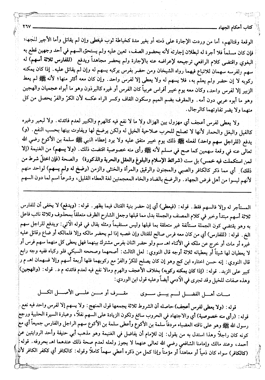 قَوْلُهُ: (وَيَدْفَعُ) لَا يَخْفَى أَنَّ لِلْفَارِسِ ثَلَاثَةَ أَسْهُمٍ مُبْتَدَأٌ وَخَبَرٌ فِي كَلَامِ الْمُصَنِّفِ وَالْجُمْلَةُ بَدَلٌ مِمَّا قَبْلَهَا وَجَعَلَ الشَّارِحُ الظَّرْفَ مُتَعَلِّقًا بِمَحْذُوفٍ وَثَلَاثَةً نَائِبَ فَاعِلٍ بِهِ وَهُوَ يَقْتَضِي كَوْنَ الْجُمْلَةِ مُسْتَأْنَفَةً غَيْرَ مُتَعَلِّقَةٍ بِمَا قَبْلَهَا وَلَيْسَ مُسْتَقِيمًا وَمِثْلُهُ يُقَالُ فِي قَوْلِهِ الْآتِي: وَيُدْفَعُ لِلرَّاجِلِ سَهْمٌ إلَخْ.