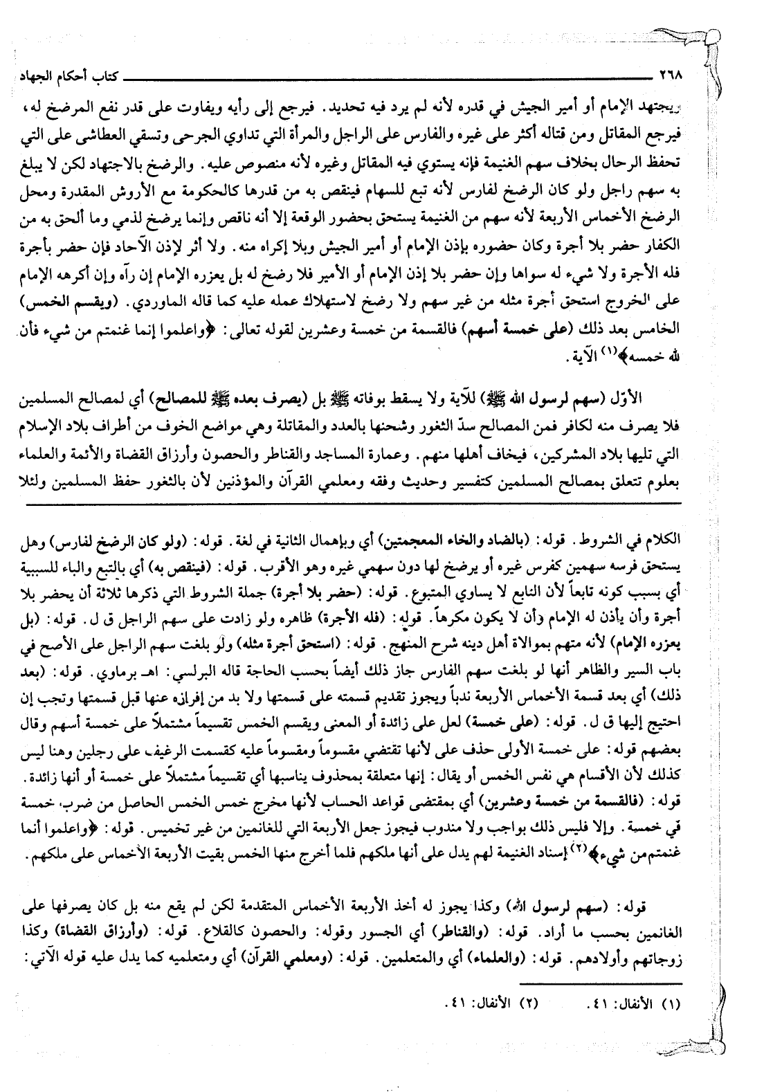 (وَيَقْسِمُ الْخُمُسَ) الْخَامِسَ بَعْدَ ذَلِكَ (عَلَى خَمْسَةِ أَسْهُمٍ) فَالْقِسْمَةُ مِنْ خَمْسَةٍ وَعِشْرِينَ لِقَوْلِهِ تَعَالَى: {وَاعْلَمُوا أَنَّمَا غَنِمْتُمْ مِنْ شَيْءٍ فَأَنَّ لِلَّهِ خُمُسَهُ} [الأنفال: 41] الْآيَةَ. الْأَوَّلُ (سَهْمٌ لِرَسُولِ اللَّهِ - صَلَّى اللَّهُ عَلَيْهِ وَسَلَّمَ -) لِلْآيَةِ وَلَا يَسْقُطُ بِوَفَاتِهِ - صَلَّى اللَّهُ عَلَيْهِ وَسَلَّمَ - بَلْ (يُصْرَفُ بَعْدَهُ - صَلَّى اللَّهُ عَلَيْهِ وَسَلَّمَ - لِلْمَصَالِحِ) أَيْ لِمَصَالِح الْمُسْلِمِينَ فَلَا يُصْرَفُ مِنْهُ لِكَافِرٍ فَمِنْ الْمَصَالِحِ سَدُّ الثُّغُورِ وَشَحْنُهَا بِالْعَدَدِ وَالْمُقَاتِلَةِ وَهِيَ مَوَاضِعُ الْخَوْفِ مِنْ أَطْرَافِ بِلَادِ الْإِسْلَامِ الَّتِي تَلِيهَا بِلَادُ الْمُشْرِكِينَ، فَيَخَافُ أَهْلُهَا مِنْهُمْ. وَعِمَارَةُ الْمَسَاجِدِ وَالْقَنَاطِرِ وَالْحُصُونِ وَأَرْزَاقِ الْقُضَاةِ وَالْأَئِمَّةِ وَالْعُلَمَاءِ بِعُلُومٍ تَتَعَلَّقُ بِمَصَالِحِ الْمُسْلِمِينَ كَتَفْسِيرٍ وَحَدِيثٍ وَفِقْهٍ وَمُعَلِّمِي الْقُرْآنِ وَالْمُؤَذِّنِينَ لِأَنَّ بِالثُّغُورِ حِفْظَ الْمُسْلِمِينَ وَلِئَلَّا