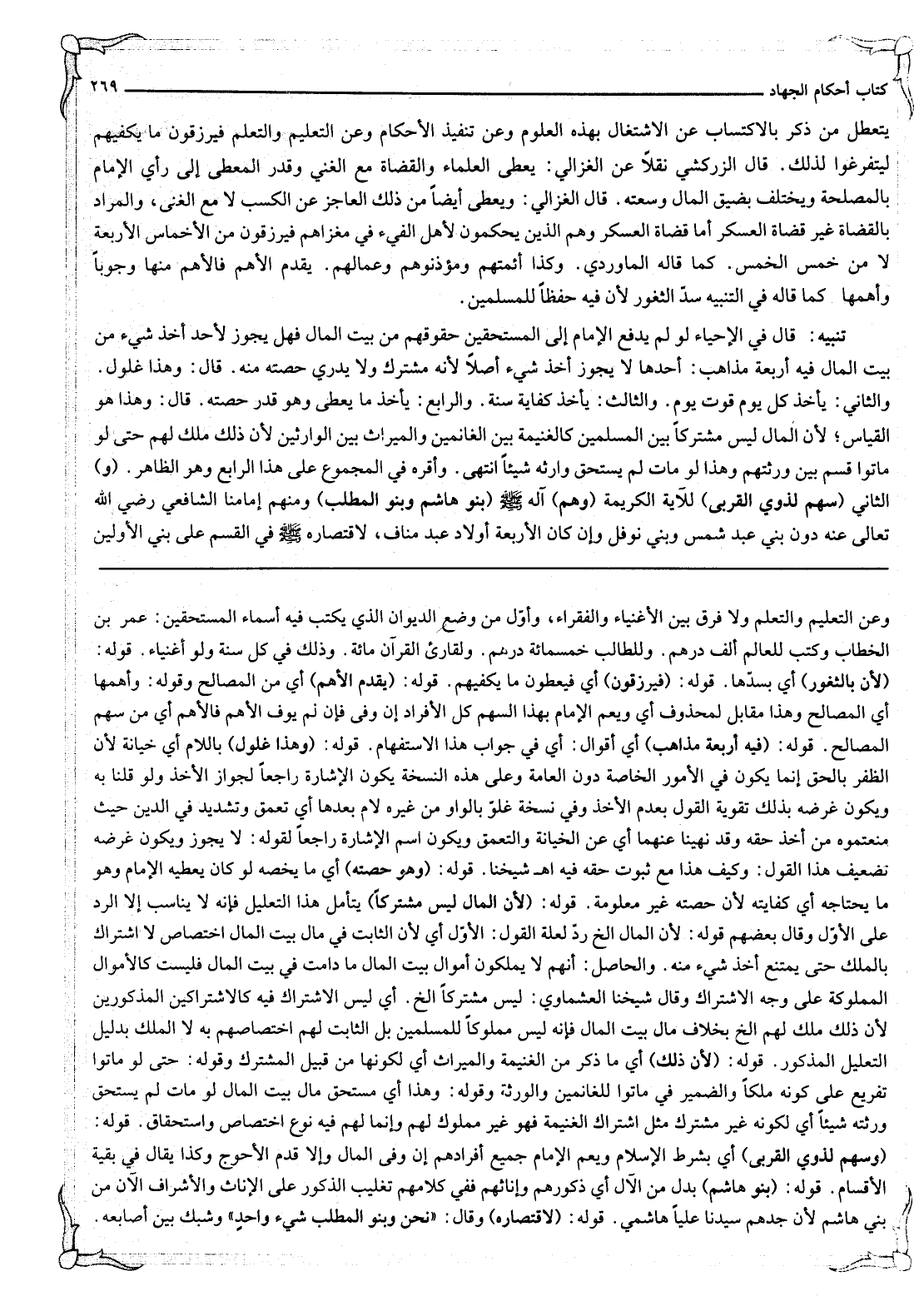 يَتَعَطَّلَ مَنْ ذُكِرَ بِالِاكْتِسَابِ عَنْ الِاشْتِغَالِ بِهَذِهِ الْعُلُومِ وَعَنْ تَنْفِيذِ الْأَحْكَامِ وَعَنْ التَّعْلِيمِ وَالتَّعَلُّمِ فَيُرْزَقُونَ مَا يَكْفِيهِمْ لِيَتَفَرَّغُوا لِذَلِكَ. قَالَ الزَّرْكَشِيّ نَقْلًا عَنْ الْغَزَالِيِّ: يُعْطَى الْعُلَمَاءُ وَالْقُضَاةُ مَعَ الْغِنَى، وَقَدْرُ الْمُعْطَى إلَى رَأْيِ الْإِمَامِ بِالْمَصْلَحَةِ وَيَخْتَلِفُ بِضِيقِ الْمَالِ وَسِعَتِهِ. قَالَ الْغَزَالِيُّ: وَيُعْطَى أَيْضًا مِنْ ذَلِكَ الْعَاجِزُ عَنْ الْكَسْبِ لَا مَعَ الْغِنَى، وَالْمُرَادُ بِالْقُضَاةِ غَيْرُ قُضَاةِ الْعَسْكَرِ أَمَّا قُضَاةُ الْعَسْكَرِ وَهُمْ الَّذِينَ يَحْكُمُونَ لِأَهْلِ الْفَيْءِ فِي مَغْزَاهُمْ فَيُرْزَقُونَ مِنْ الْأَخْمَاسِ الْأَرْبَعَةِ لَا مِنْ خُمُسِ الْخُمُسِ. كَمَا قَالَهُ الْمَاوَرْدِيُّ. وَكَذَا أَئِمَّتُهُمْ وَمُؤَذِّنُوهُمْ وَعُمَّالُهُمْ. يُقَدَّمُ الْأَهَمُّ فَالْأَهَمُّ مِنْهَا وُجُوبًا وَأَهَمُّهَا كَمَا قَالَهُ فِي التَّنْبِيهِ سَدُّ الثُّغُورِ لِأَنَّ فِيهِ حِفْظًا لِلْمُسْلِمِينَ. تَنْبِيهٌ قَالَ فِي الْإِحْيَاءِ لَوْ لَمْ يَدْفَعْ الْإِمَامُ إلَى الْمُسْتَحِقِّينَ حُقُوقَهُمْ مِنْ بَيْتِ الْمَالِ فَهَلْ يَجُوزُ لِأَحَدٍ أَخْذُ شَيْءٍ مِنْ بَيْتِ الْمَالِ فِيهِ أَرْبَعَةُ مَذَاهِبَ: أَحَدُهَا لَا يَجُوزُ أَخْذُ شَيْءٍ أَصْلًا لِأَنَّهُ مُشْتَرَكٌ وَلَا يَدْرِي حِصَّتَهُ مِنْهُ. قَالَ: وَهَذَا غُلُولٌ.