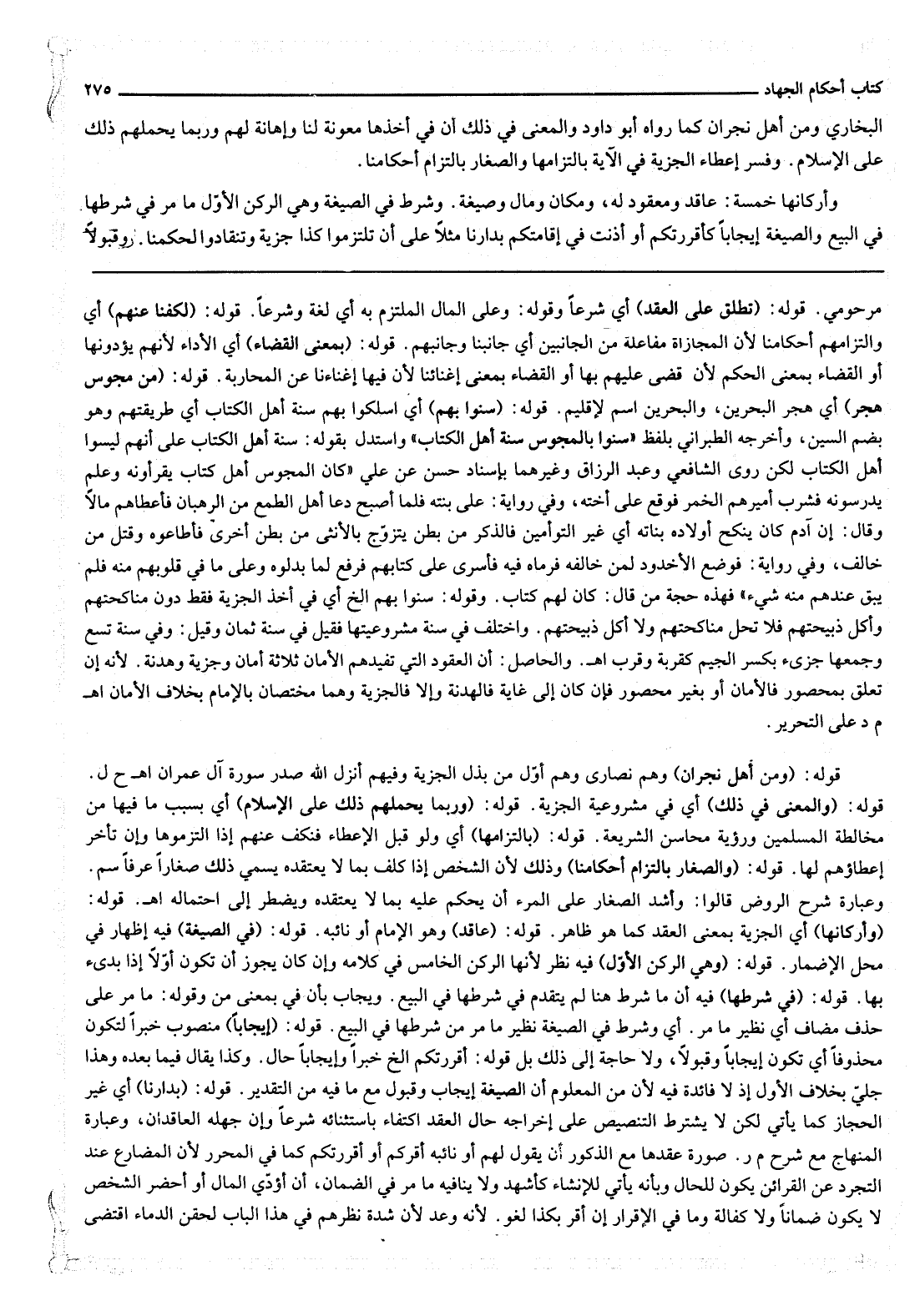 الْبُخَارِيُّ وَمِنْ أَهْلِ نَجْرَانَ كَمَا رَوَاهُ أَبُو دَاوُد وَالْمَعْنَى فِي ذَلِكَ أَنَّ فِي أَخْذِهَا مَعُونَةً لَنَا وَإِهَانَةً لَهُمْ وَرُبَّمَا يَحْمِلُهُمْ ذَلِكَ عَلَى الْإِسْلَامِ. وَفَسَّرَ إعْطَاءَ الْجِزْيَةِ فِي الْآيَةِ بِالْتِزَامِهَا وَالصَّغَارَ بِالْتِزَامِ أَحْكَامِنَا. وَأَرْكَانُهَا خَمْسَةٌ: عَاقِدٌ وَمَعْقُودٌ لَهُ، وَمَكَانٌ وَمَالٌ وَصِيغَةٌ. وَشَرَطَ فِي الصِّيغَةِ وَهِيَ الرُّكْنُ الْأَوَّلُ مَا مَرَّ فِي شَرْطِهَا فِي الْبَيْعِ وَالصِّيغَةُ إيجَابًا كَأَقْرَرْتُكُمْ أَوْ أَذِنْت فِي إقَامَتِكُمْ بِدَارِنَا مَثَلًا عَلَى أَنْ تَلْتَزِمُوا كَذَا جِزْيَةً وَتَنْقَادُوا لِحُكْمِنَا. وَقَبُولًا