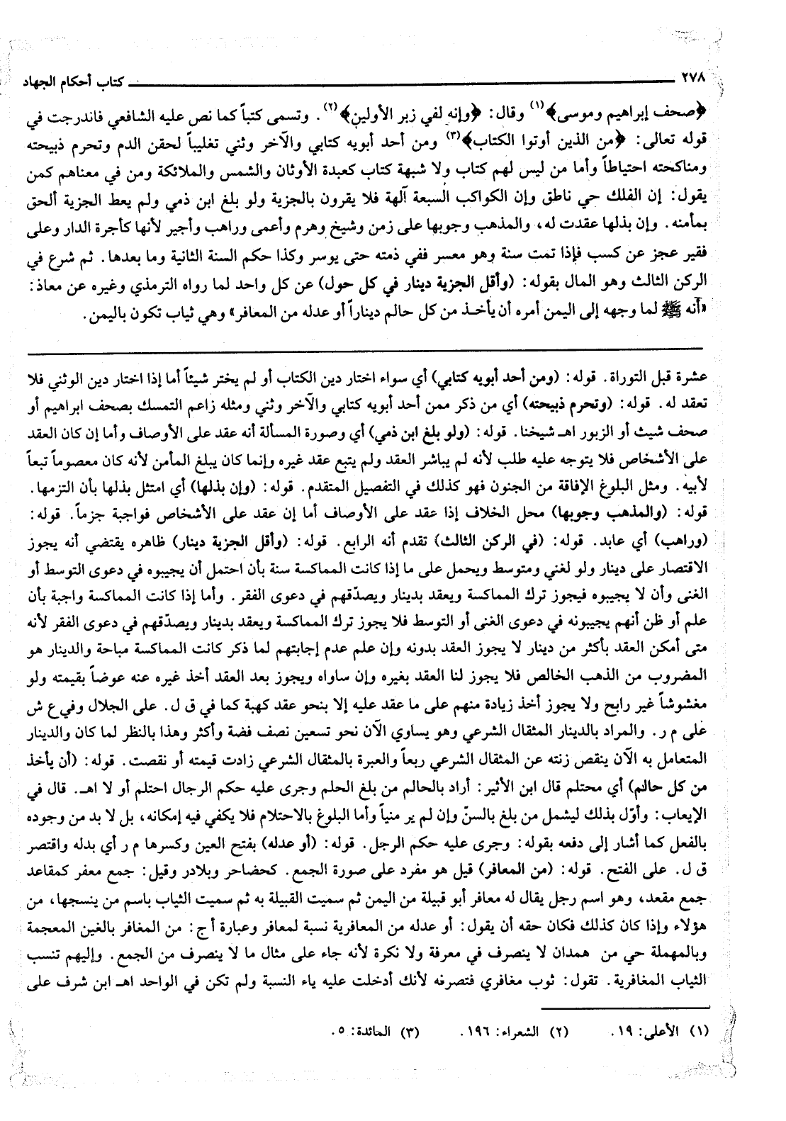 وَتُسَمَّى كُتُبًا كَمَا نَصَّ عَلَيْهِ الشَّافِعِيُّ فَانْدَرَجَتْ فِي قَوْله تَعَالَى: {مِنَ الَّذِينَ أُوتُوا الْكِتَابَ} [البقرة: 101] وَمَنْ أَحَدُ أَبَوَيْهِ كِتَابِيٌّ وَالْآخَرُ وَثَنِيٌّ تَغْلِيبًا لِحَقْنِ الدَّمِ وَتُحَرَّمُ ذَبِيحَتُهُ وَمُنَاكَحَتُهُ احْتِيَاطًا وَأَمَّا مَنْ لَيْسَ لَهُمْ كِتَابٌ وَلَا شُبْهَةُ كِتَابٍ كَعَبَدَةِ الْأَوْثَانِ وَالشَّمْسِ وَالْمَلَائِكَةِ وَمَنْ فِي مَعْنَاهُمْ كَمَنْ يَقُولُ: إنَّ الْفُلْكَ حَيٌّ نَاطِقٌ وَإِنَّ الْكَوَاكِبَ السَّبْعَةَ آلِهَةٌ فَلَا يُقِرُّونَ بِالْجِزْيَةِ وَلَوْ بَلَغَ ابْنُ ذِمِّيٍّ وَلَمْ يُعْطِ الْجِزْيَةَ أُلْحِقَ بِمَأْمَنِهِ. وَإِنْ بَذَلَهَا عُقِدَتْ لَهُ، وَالْمَذْهَبُ وُجُوبُهَا عَلَى زَمِنٍ وَشَيْخٍ وَهَرَمٍ وَأَعْمَى وَرَاهِبٍ وَأَجِيرٍ لِأَنَّهَا كَأُجْرَةِ الدَّارِ وَعَلَى فَقِيرٍ عَجَزَ عَنْ كَسْبٍ فَإِذَا تَمَّتْ سَنَةٌ وَهُوَ مُعْسِرٌ فَفِي ذِمَّتِهِ حَتَّى يُوسِرَ وَكَذَا حُكْمُ السَّنَةِ الثَّانِيَةِ وَمَا بَعْدَهَا.