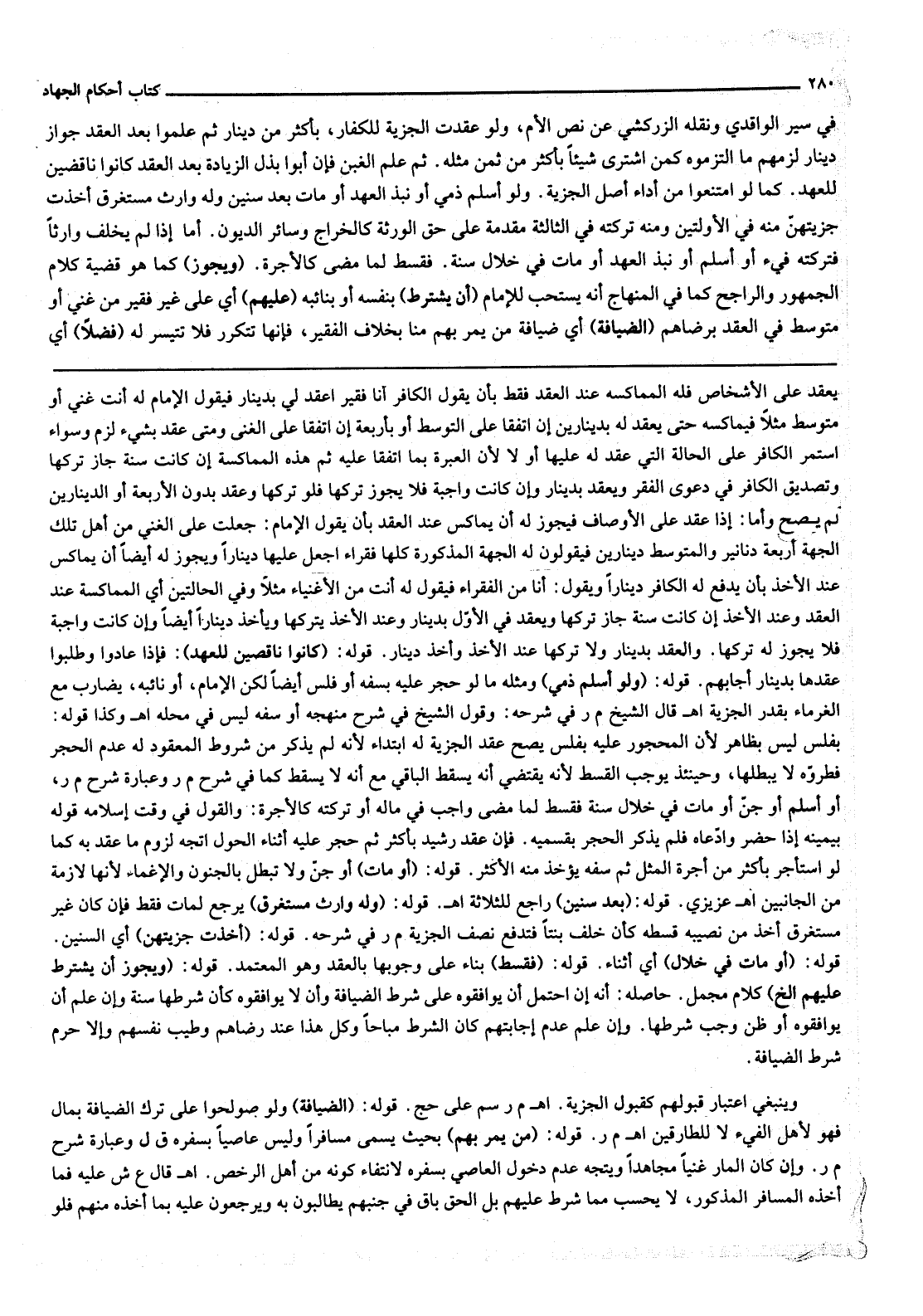 فِي سِيَرِ الْوَاقِدِيِّ وَنَقَلَهُ الزَّرْكَشِيّ عَنْ نَصِّ الْأُمِّ، وَلَوْ عُقِدَتْ الْجِزْيَةُ لِلْكُفَّارِ، بِأَكْثَرَ مِنْ دِينَارٍ ثُمَّ عَلِمُوا بَعْدَ الْعَقْدِ جَوَازَ دِينَارٍ لَزِمَهُمْ مَا الْتَزَمُوهُ كَمَنْ اشْتَرَى شَيْئًا بِأَكْثَرَ مِنْ ثَمَنِ مِثْلِهِ ثُمَّ عَلِمَ الْغَبْنَ. فَإِنْ أَبَوْا بَذْلَ الزِّيَادَةِ بَعْدَ الْعَقْدِ كَانُوا نَاقِضِينَ لِلْعَهْدِ. كَمَا لَوْ امْتَنَعُوا مِنْ أَدَاءِ أَصْلِ الْجِزْيَةِ. وَلَوْ أَسْلَمَ ذِمِّيٌّ أَوْ نَبَذَ الْعَهْدَ أَوْ مَاتَ بَعْدَ سِنِينَ وَلَهُ وَارِثٌ مُسْتَغْرِقٌ أُخِذَتْ جِزْيَتُهُنَّ مِنْهُ فِي الْأُولَتَيْنِ وَمِنْهُ: تَرِكَتُهُ فِي الثَّالِثَةِ مُقَدَّمَةٌ عَلَى حَقِّ الْوَرَثَةِ كَالْخَرَاجِ وَسَائِرِ الدُّيُونِ. أَمَّا إذَا لَمْ يَخْلُفْ وَارِثًا فَتَرِكَتُهُ فَيْءٌ أَوْ أَسْلَمَ أَوْ نَبَذَ الْعَهْدَ أَوْ مَاتَ فِي خِلَالِ سَنَةٍ. فَقِسْطٌ لِمَا مَضَى كَالْأُجْرَةِ.