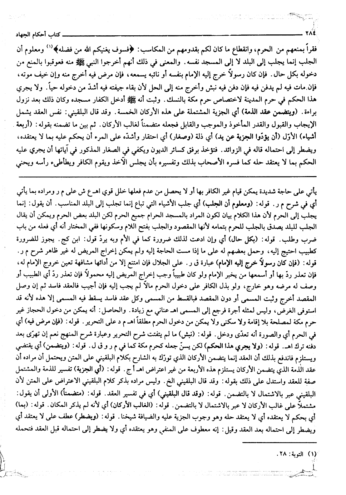 ـــــــــــــــــــــــــــــQيَأْتِي عَلَى حَاجَةٍ شَدِيدَةٍ يُمْكِنُ قِيَامُ غَيْرِ الْكَافِرِ بِهَا أَوْ لَا يَحْصُلُ مِنْ عَدَمِ فِعْلِهَا خَلَلٌ قَوِيٌّ. اهـ. ع ش عَلَى م ر وَمُرَادُهُ بِمَا يَأْتِي أَيْ فِي شَرْحِ م ر. قَوْلُهُ: (وَمَعْلُومٌ أَنَّ الْجَلَبَ) أَيْ جَلَبُ الْأَشْيَاءِ الَّتِي تُبَاعُ إنَّمَا تُجْلَبُ إلَى الْبَلَدِ الْمُنَاسِبِ. أَنْ يَقُولَ: إنَّمَا يُجْلَبُ إلَى الْحَرَمِ لِأَنَّ هَذَا الْكَلَامَ بَيَانٌ لِكَوْنِ الْمُرَادِ بِالْمَسْجِدِ الْحَرَامِ جَمِيعَ الْحَرَمِ لَكِنَّ الْبَلَدَ بَعْضُ الْحَرَمِ وَيُمْكِنُ أَنْ يُقَالَ: الْجَلَبُ لِلْبَلَدِ يَصْدُقُ بِالْجَلَبِ لِلْحَرَمِ بِتَمَامِهِ لِأَنَّهَا الْمَقْصُودُ. وَالْجَلَبُ بِفَتْحِ اللَّامِ وَسُكُونِهَا فَفِي الْمُخْتَارِ أَنَّهُ أَيْ فِعْلُهُ مِنْ بَابِ ضَرَبَ وَطَلَبَ.