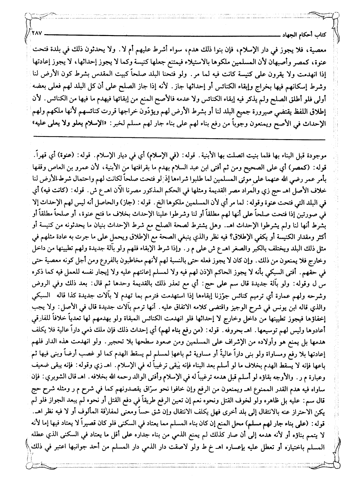 قَوْلُهُ: (كَانَتْ فِيهِ) أَيْ فِي الْبَلَدِ الَّتِي فُتِحَتْ عَنْوَةً وَقَوْلُهُ: لِمَا مَرَّ أَيْ لِأَنَّ الْمُسْلِمِينَ مَلَكُوهَا إلَخْ. قَوْلُهُ: (جَازَ) وَالْحَاصِلُ أَنَّهُ لَيْسَ لَهُمْ الْإِحْدَاثُ إلَّا فِي صُورَتَيْنِ إذَا فُتِحَتْ صُلْحًا عَلَى أَنَّهَا لَهُمْ مُطْلَقًا أَوْ لَنَا وَشَرَطُوا عَلَيْنَا الْإِحْدَاثَ بِخِلَافِ مَا فُتِحَ عَنْوَةً، أَوْ صُلْحًا مُطْلَقًا أَوْ بِشَرْطِ أَنَّهَا لَنَا وَلَمْ يَشْرِطُوا الْإِحْدَاثَ اهـ. وَهَلْ يُشْتَرَطُ لِصِحَّةِ الصُّلْحِ مَعَ شَرْطِ الْإِحْدَاثِ بُنْيَانَ مَا يُحْدِثُونَهُ مِنْ كَنِيسَةٍ أَوْ أَكْثَرَ وَمِقْدَارُ الْكَنِيسَةِ أَوْ يَكْفِي الْإِطْلَاقُ؟ فِيهِ نَظَرٌ وَاَلَّذِي يَنْبَغِي الصِّحَّةُ مَعَ الْإِطْلَاقِ وَيُحْمَلُ عَلَى مَا جَرَتْ بِهِ عَادَةُ مِثْلِهِمْ فِي مِثْلِ ذَلِكَ الْبَلَدِ وَيَخْتَلِفُ بِالْكِبَرِ وَالصِّغَرِ اهـ ع ش عَلَى م ر. فَإِذَا شَرَطَ الْإِبْقَاءَ فَلَهُمْ وَلَوْ بِآلَةٍ جَدِيدَةٍ وَلَهُمْ تَطْيِينُهَا مِنْ دَاخِلٍ وَخَارِجٍ فَلَا يُمْنَعُونَ مِنْ ذَلِكَ. وَإِنْ كَانَ لَا يَجُوزُ فِعْلُهُ حَتَّى بِالنِّسْبَةِ لَهُمْ لِأَنَّهُمْ مُخَاطَبُونَ بِالْفُرُوعِ وَمِنْ أَجْلِ كَوْنِهِ مَعْصِيَةً حَتَّى فِي حَقِّهِمْ. أَفْتَى السُّبْكِيُّ بِأَنَّهُ لَا يَجُوزُ لِحَاكِمٍ الْإِذْنُ لَهُمْ فِيهِ وَلَا لِمُسْلِمٍ إعَانَتُهُمْ عَلَيْهِ وَلَا إيجَارُ نَفْسِهِ لِلْعَمَلِ فِيهِ كَمَا ذَكَرَهُ س ل وَقَوْلُهُ: وَلَوْ بِآلَةٍ جَدِيدَةٍ قَالَ سم عَلَى حَجّ: أَيْ مَعَ تَعَذُّرِ ذَلِكَ بِالْقَدِيمَةِ وَحْدَهَا ثُمَّ قَالَ: بَعْدَ ذَلِكَ وَفِي الرَّوْضِ وَشَرْحِهِ وَلَهُمْ عِمَارَةُ أَيْ تَرْمِيمُ كَنَائِسَ جَوَّزْنَا إبْقَاءَهَا إذَا اسْتُهْدِمَتْ فَتُرَمَّمُ بِمَا تَهَدَّمَ لَا بِآلَاتٍ جَدِيدَةٍ كَذَا قَالَهُ السُّبْكِيُّ وَاَلَّذِي قَالَهُ ابْنُ يُونُسَ فِي شَرْحِ الْوَجِيزِ وَاقْتَضَى كَلَامُهُ الِاتِّفَاقَ عَلَيْهِ. أَنَّهَا تُرَمَّمُ بِآلَاتٍ جَدِيدَةٍ قَالَ فِي الْأَصْلِ: وَلَا يَجِبُ إخْفَاؤُهَا فَيَجُوزُ تَطْيِينُهَا مِنْ دَاخِلٍ وَخَارِجٍ لَا إحْدَاثُهَا فَلَوْ انْهَدَمَتْ الْكَنَائِسُ الْمُبْقَاةُ وَلَوْ بِهَدْمِهِمْ لَهَا تَعَدِّيًا خِلَافًا لِلْفَارِقِيِّ أَعَادُوهَا وَلَيْسَ لَهُمْ تَوْسِيعُهَا. اهـ بِحُرُوفِهِ.