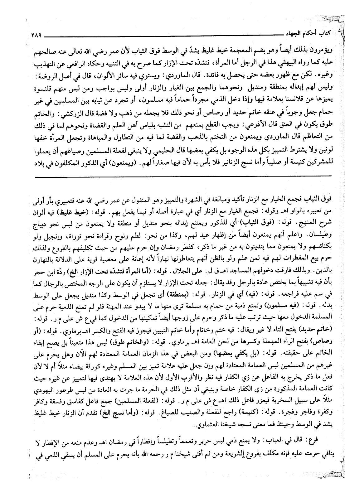 قَالَ الزَّرْكَشِيّ: وَالْخَاتَمُ طَوْقٌ يَكُونُ فِي الْعُنُقِ قَالَ الْأَذْرَعِيُّ: وَيَجِبُ الْقَطْعُ بِمَنْعِهِمْ مِنْ التَّشَبُّهِ بِلِبَاسِ أَهْلِ الْعِلْمِ وَالْقُضَاةِ وَنَحْوِهِمْ لِمَا فِي ذَلِكَ مِنْ التَّعَاظُمِ قَالَ الْمَاوَرْدِيُّ وَيُمْنَعُونَ مِنْ التَّخَتُّمِ بِالذَّهَبِ وَالْفِضَّةِ لِمَا فِيهِ مِنْ التَّطَاوُلِ وَالْمُبَاهَاةِ وَتَجْعَلُ الْمَرْأَةُ خُفَّهَا لَوْنَيْنِ وَلَا يُشْتَرَطُ التَّمْيِيزُ بِكُلِّ هَذِهِ الْوُجُوهِ بَلْ يَكْفِي بَعْضُهَا قَالَ الْحَلِيمِيُّ وَلَا يَنْبَغِي لِفَعَلَةِ الْمُسْلِمِينَ وَصُيَّاغِهِمْ أَنْ يَعْمَلُوا لِلْمُشْرِكِينَ كَنِيسَةً أَوْ صَلِيبًا وَأَمَّا نَسْجُ الزَّنَانِيرِ فَلَا بَأْسَ بِهِ لِأَنَّ فِيهَا صَغَارًا لَهُمْ. (وَيُمْنَعُونَ) أَيْ الذُّكُورُ الْمُكَلَّفُونَ فِي بِلَادِ