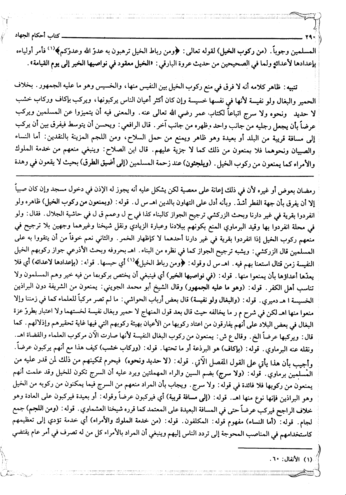 وَبَحَثَ الْأَذْرَعِيُّ جَوَازَ رُكُوبِهِمْ الْخَيْلَ النَّفِيسَةَ زَمَنَ قِتَالٍ اسْتَعَنَّا بِهِمْ فِيهِ اهـ. س ل وَقَوْلُهُ: {وَمِنْ رِبَاطِ الْخَيْلِ} [الأنفال: 60] أَيْ حَبْسِهَا. قَوْلُهُ (بِإِعْدَادِهَا لِأَعْدَائِهِ) أَيْ فَلَا يَعُدُّهَا أَعْدَاؤُهَا بِأَنْ يُمْنَعُوا مِنْهَا. قَوْلُهُ: «فِي نَوَاصِيهَا الْخَيْرُ» أَيْ فَيَنْبَغِي أَنْ يَخْتَصَّ بِرُكُوبِهَا مَنْ فِيهِ خَيْرٌ وَهُمْ الْمُسْلِمُونَ وَلَا تُنَاسِبُ أَهْلَ الْكُفْرِ.